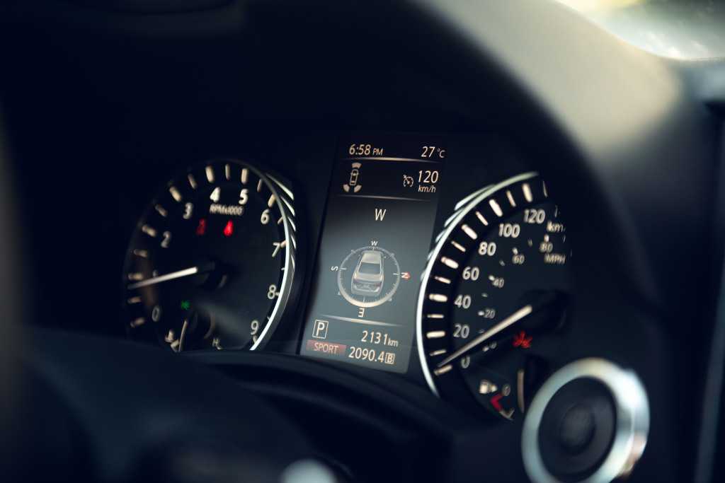 - Интеллектуальный круиз-контроль. Особенность функции заключается в возможности выбора скоростного режима, которого придерживается автомобиль. Но в отличие от стандартной опции, Инфинити новой модели контролирует дистанцию до впереди идущего авто и автоматически притормаживает, если это необходимо, с последующим разгоном до заданной скорости.