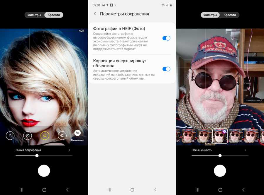 Съемку легко разнообразить не только наложением подходящего фильтра, но и опциями «бьютификации» лица, включая гладкость и тон кожи, глаза и линию подбородка. На вкладке «Параметры сохранения» предлагается активировать коррекцию искажений ультра широкоугольного объектива, а также сохранять снимки в экономном формате HEIF.