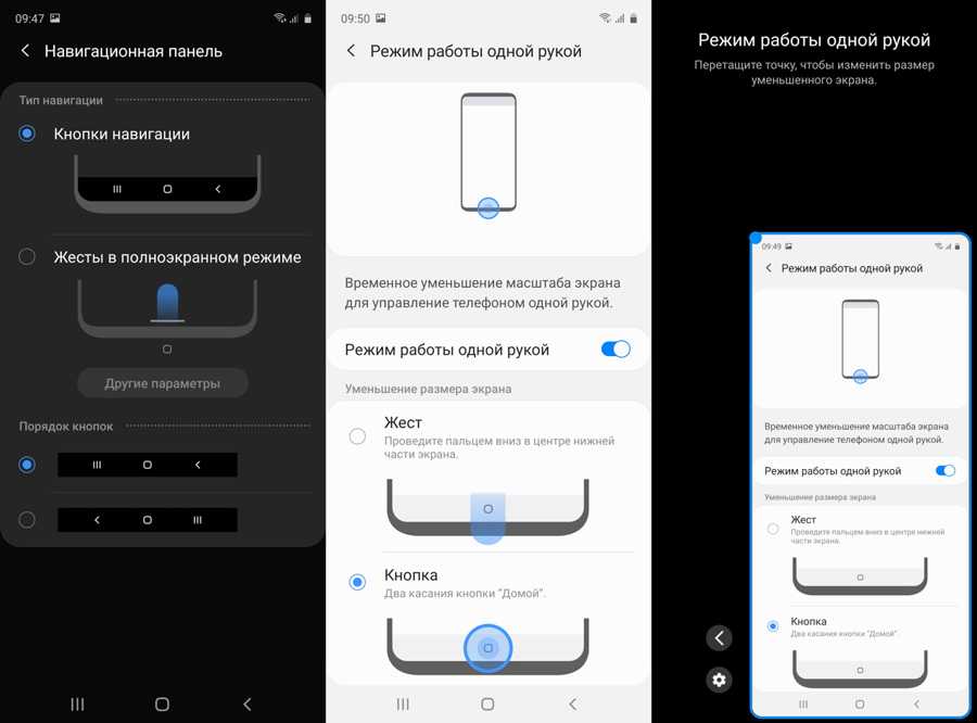 Для навигационной панели рекомендуется выбрать порядок пиктограмм «Недавние приложения» и «Назад». Стоит отметить, что для управления удобно использовать жесты. Двойным касанием виртуальной кнопки «Домой» или свайпом вниз (жест) в нижней части экрана активируется режим управления одной рукой.