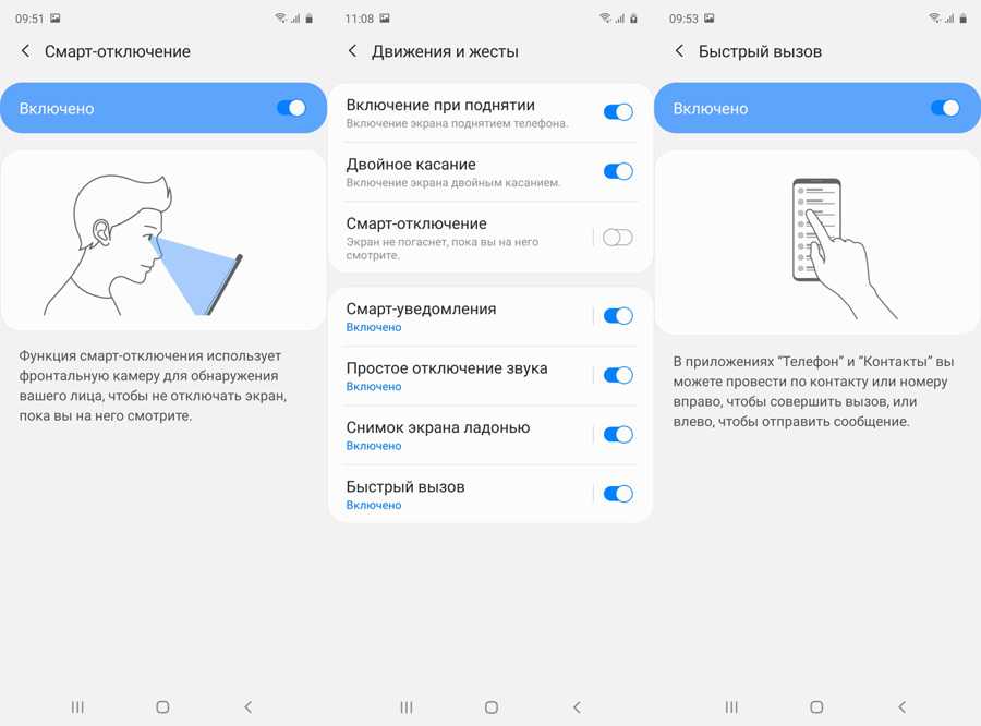 В разделе «Дополнительные функции» предлагается выбрать движения и жесты, упрощающие управление смартфоном. Среди них, например, включение экрана двойным тапом, быстрый вызов свайпом вправо по контакту, смарт-отключение экрана и т.п.