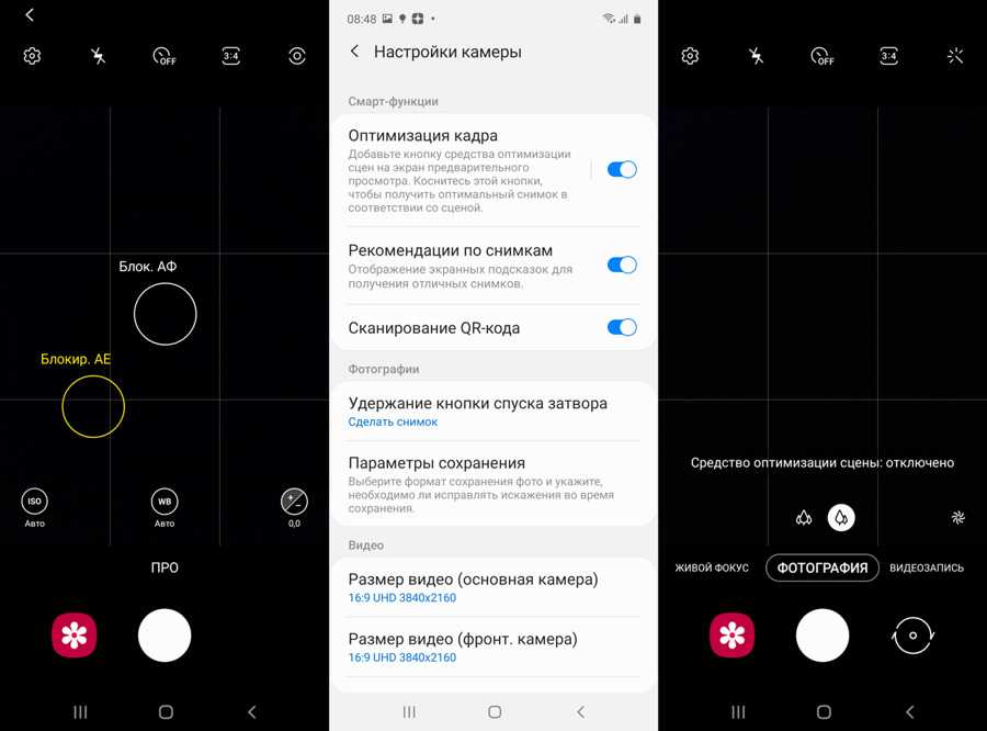 Значения светочувствительности ISO, баланс белого и ступени экспокоррекции самостоятельно настраиваются только для «Про»-режима. Также вручную выбирается способ экспозамера – точечный, матричный или центровзвешенный. Чтобы при изменении положения объектов или смене условий освещения камера не выполняла корректировку автоматически, настройки фокуса или экспозиции можно зафиксировать. В режиме «Фотография» над текстовыми пиктограммами режимов съемки находятся значки для выбора объектива и кнопка оптимизации сцены. Напомним, что для 48-МП сенсора по умолчанию используется счетверенный цветной фильтр Байера, когда фотодиоды для одного цвета объединяются в группы по четыре, формируя 12-мегапиксельное изображение. Возможность съемки в 48-мегапиксельном разрешении скрыли в настройках соотношения сторон кадра – «3:4H». При выборе соответствующей опции можно получать экранные подсказки прямо во время съемки. Режим HDR активирован постоянно, либо включается по необходимости.