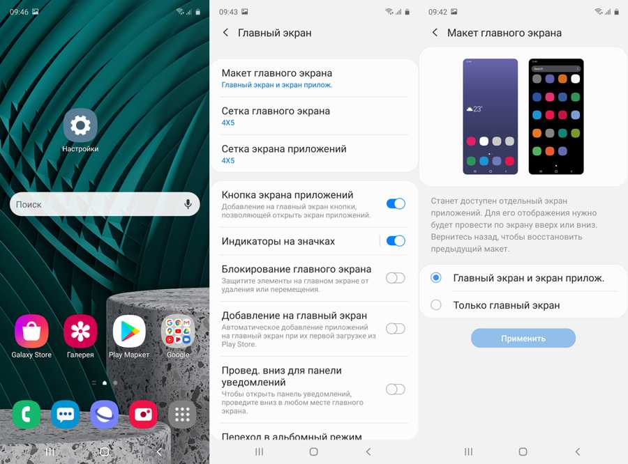 В настройках главного экрана можно определиться не только с сетками расположения значков, но и с наличием отдельного экрана приложений, а также отображением для него специальной кнопки и т.п.