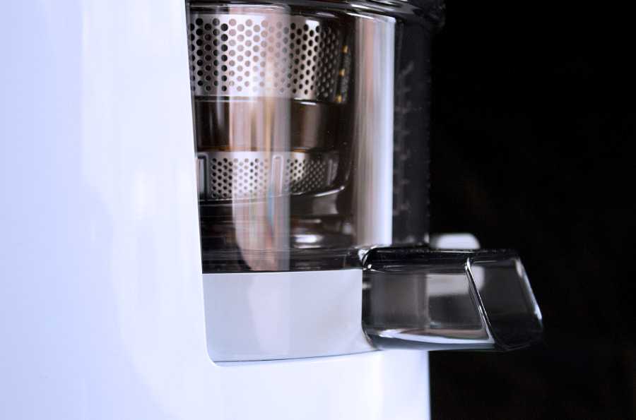 Вертикальный шнековый агрегат с широкой горловиной работает тихо, но довольно медленно. Выжимает сок в стакан на 800 мл, выброс мякоти происходит автоматически, есть система анти-капля.