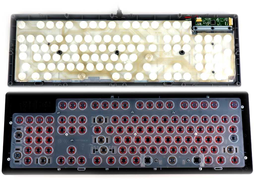 Колпачки клавиш располагаются над клавиатурой, что придает