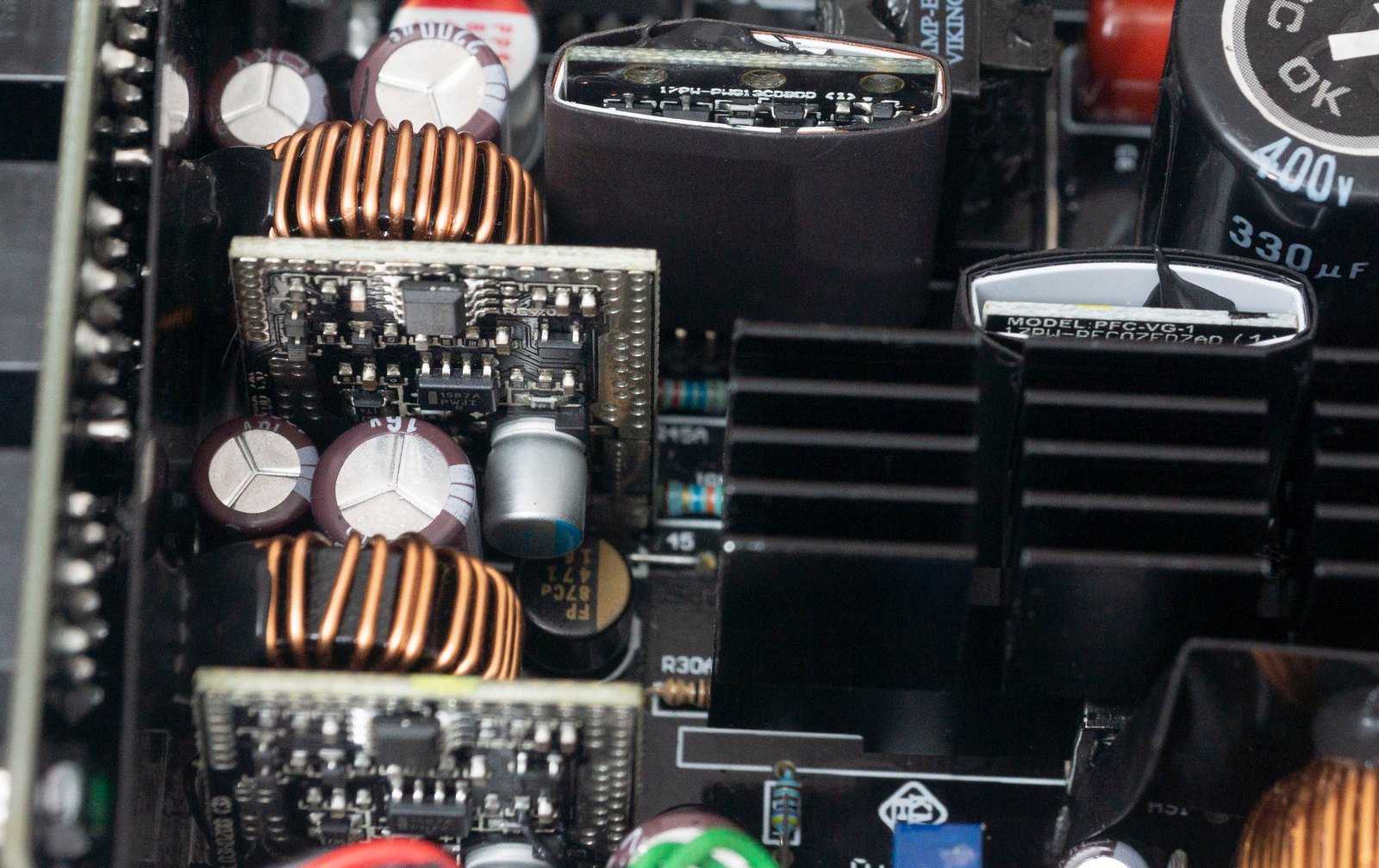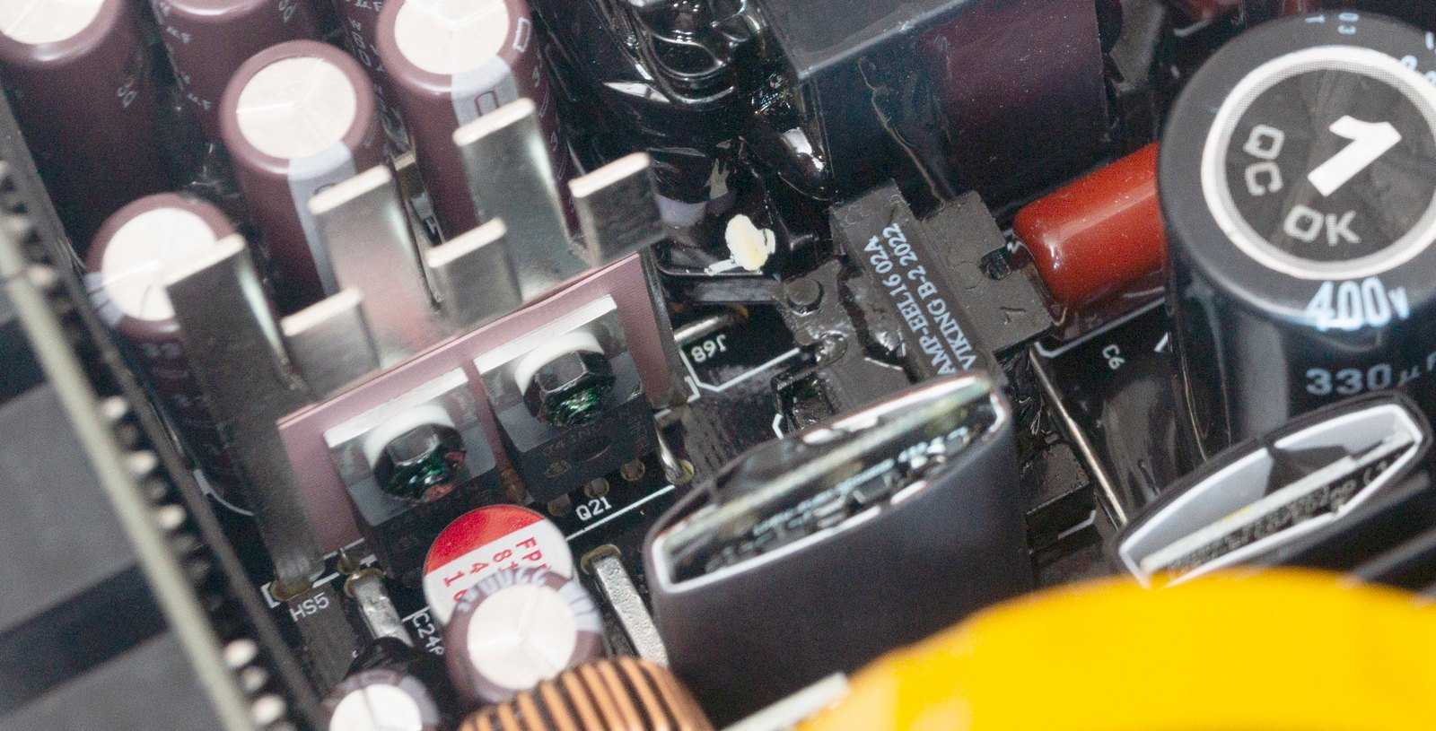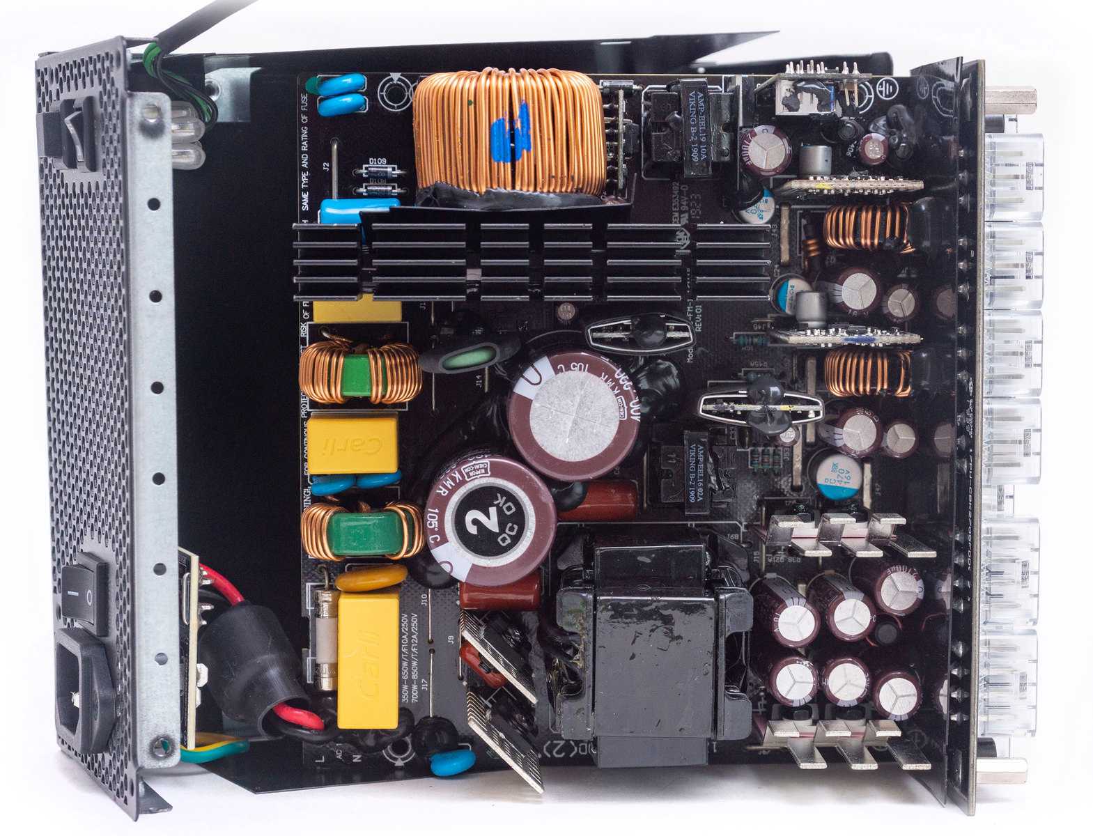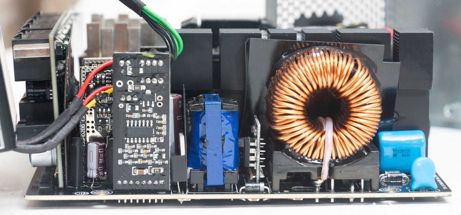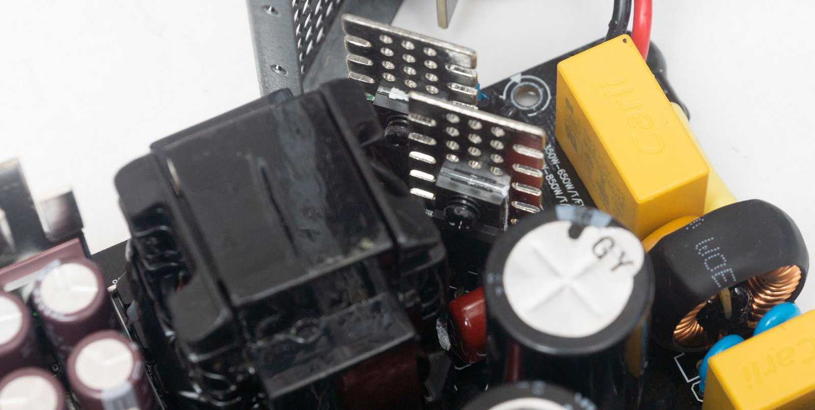 Внутреннее исполнение аккуратное. Относительно небольшая мощность в 650 Вт и размещение части элементов на компактных вертикальных платах позволили разместить силовые элементы без нагромождения, чтобы обеспечить нормальное охлаждение потоком воздуха от вентилятора.