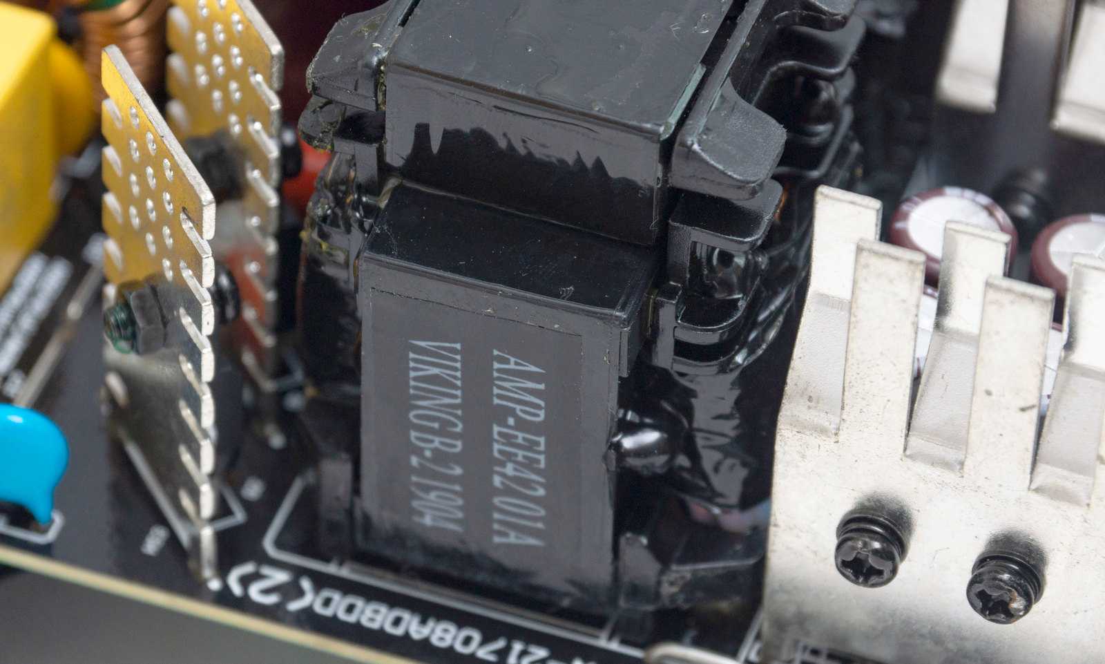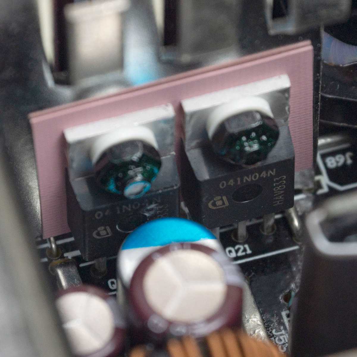 Непосредственно возле них находится трансформатор формирующий линию +12 В. За трансформатором — еще два радиатора с разветвлённой верхней гребенкой, на каждом по два транзистора Infineon IPP041N04N, которые отвечают за линию +12 В.