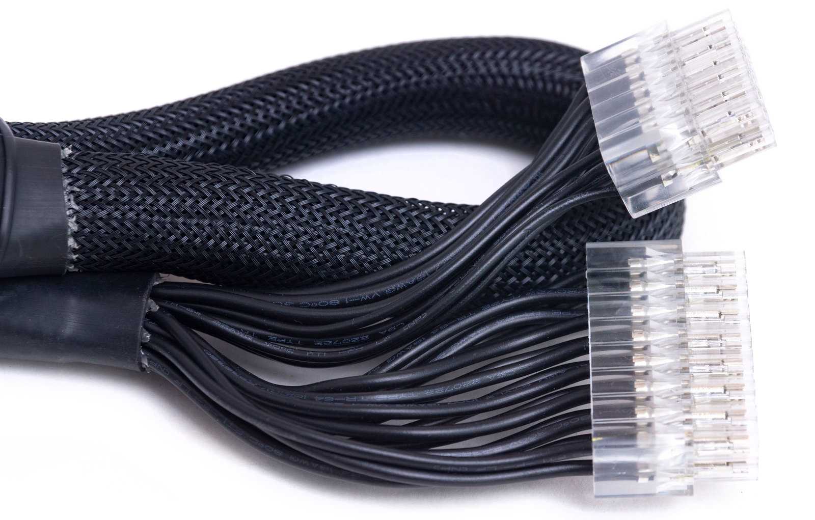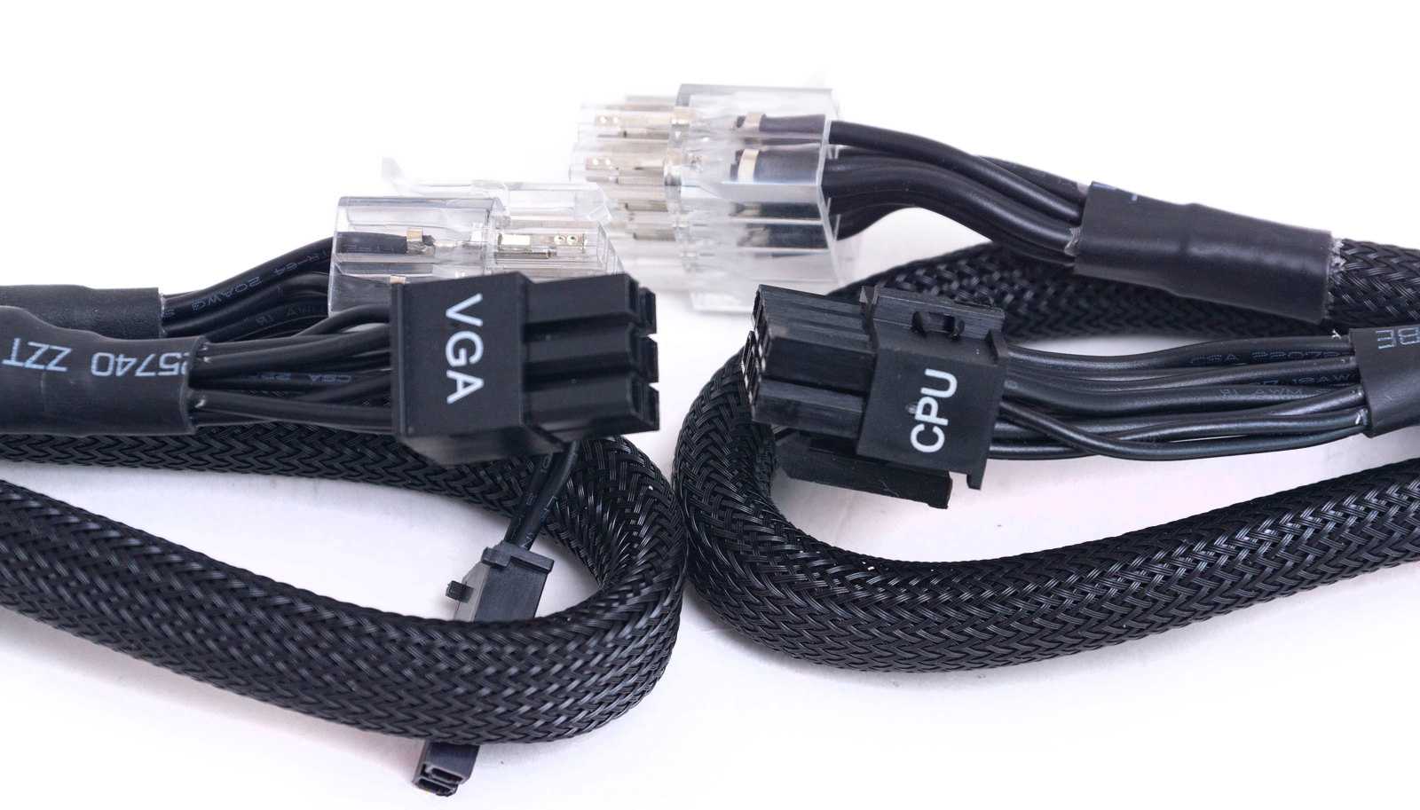 Кабели ATX, EPS и PCI-E в нейлоновой оплетке, для подключения периферии в виде плоских шлейфов. Коннекторы, подключаемые к разъемам блока питания, выполнены из прозрачного акрила. Все коннекторы подписаны белой краской.