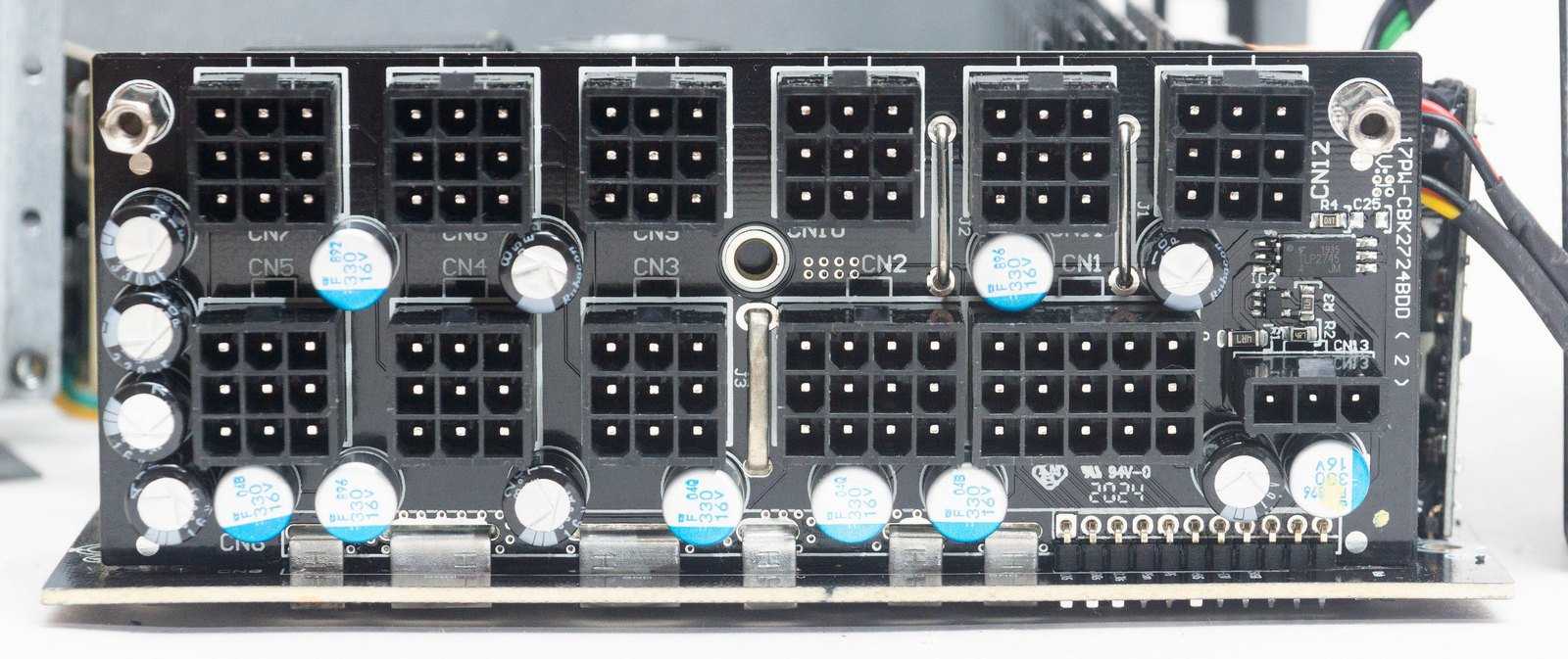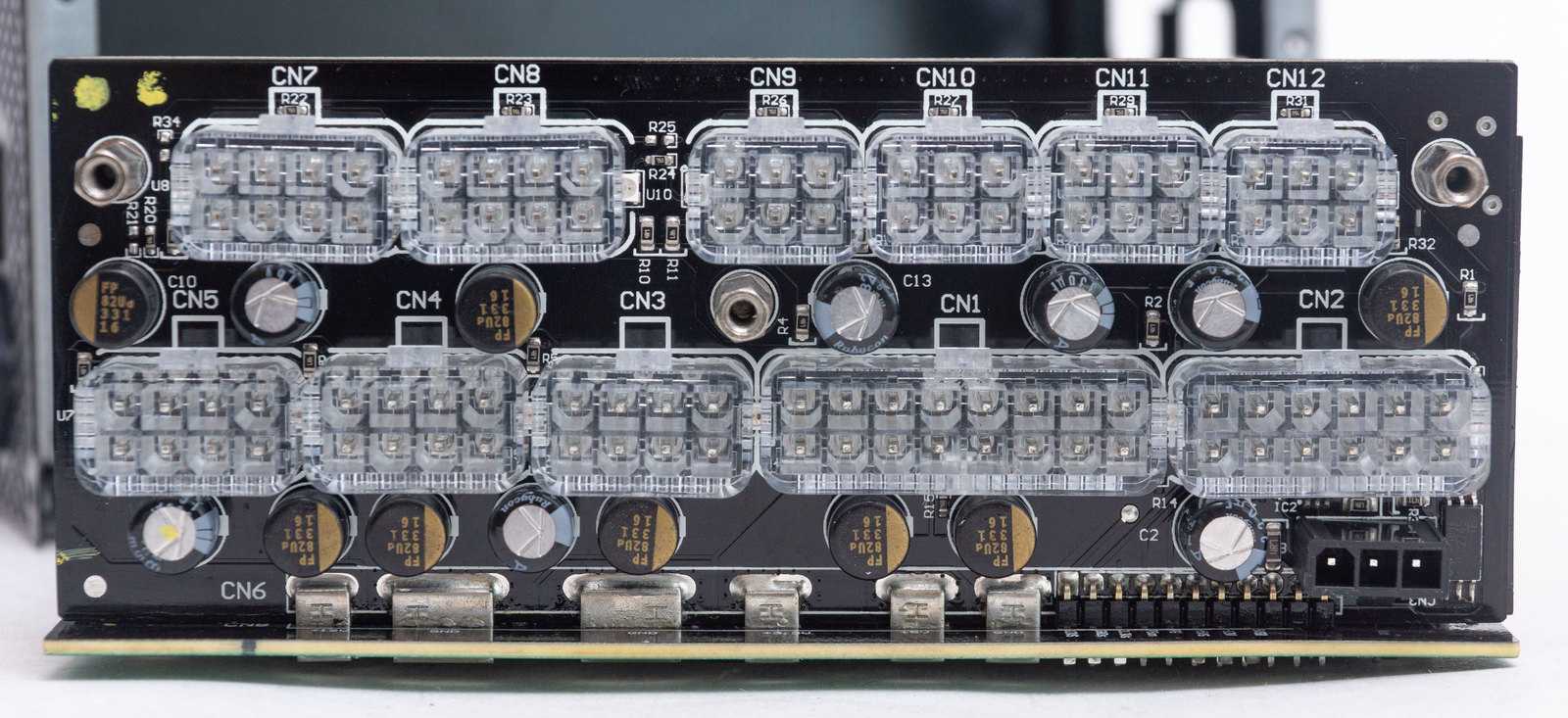 Непосредственно на плате с разъемами для модульных кабелей распаяны еще дополнительные фильтрующие полимерные конденсаторы.