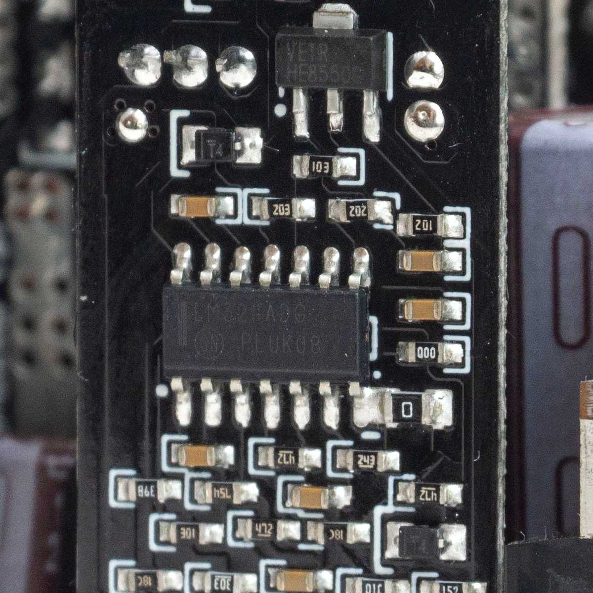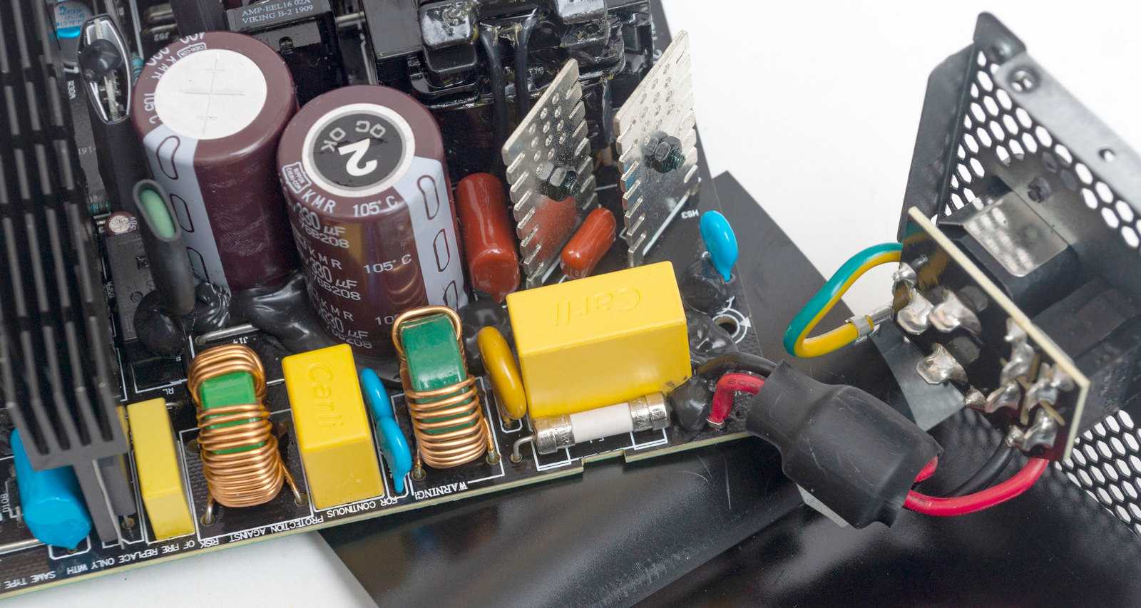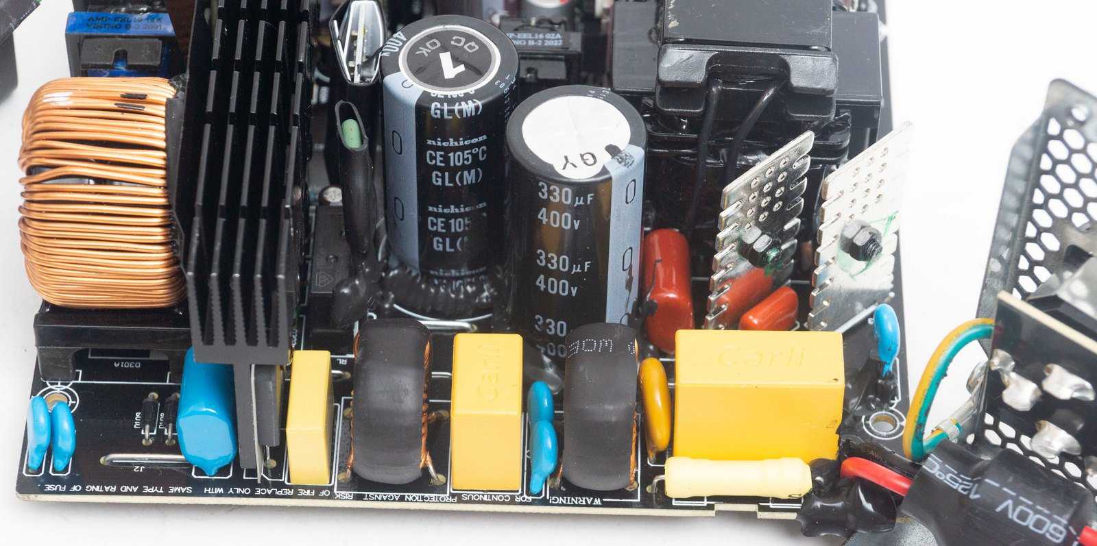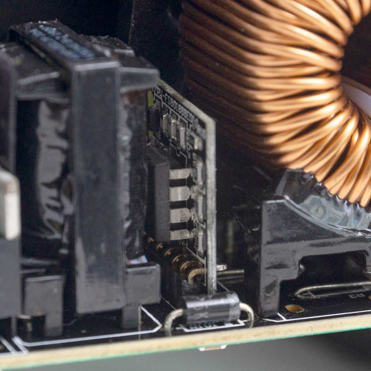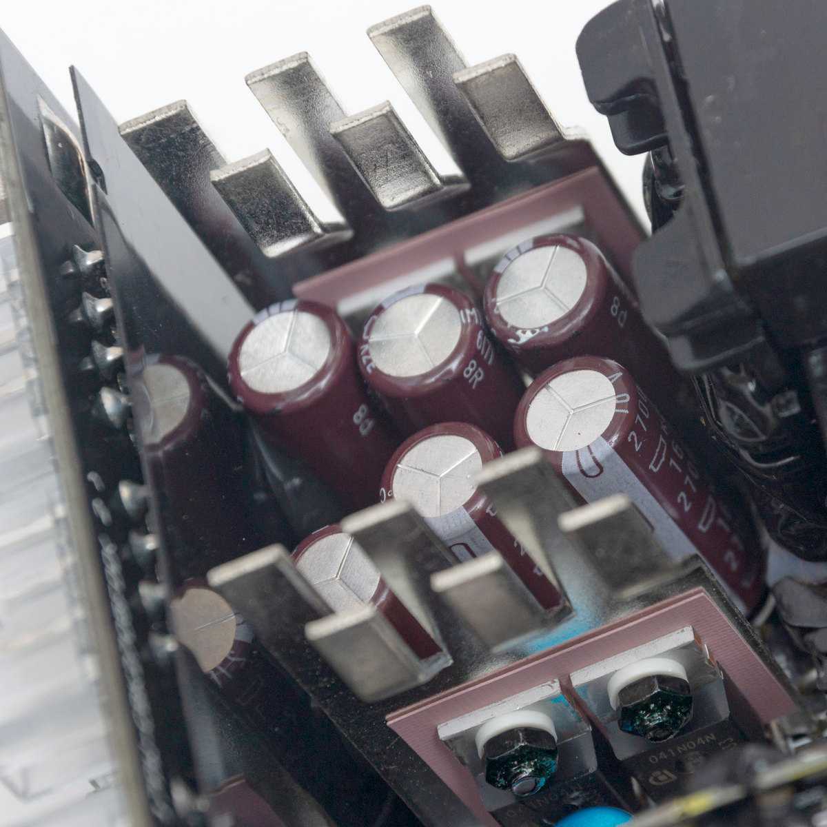 Фильтрация помех на выходах осуществляется за счет электролитических конденсаторов японского производства Nippon Chemi-Con, рассчитанных на температуру до 105 °C.