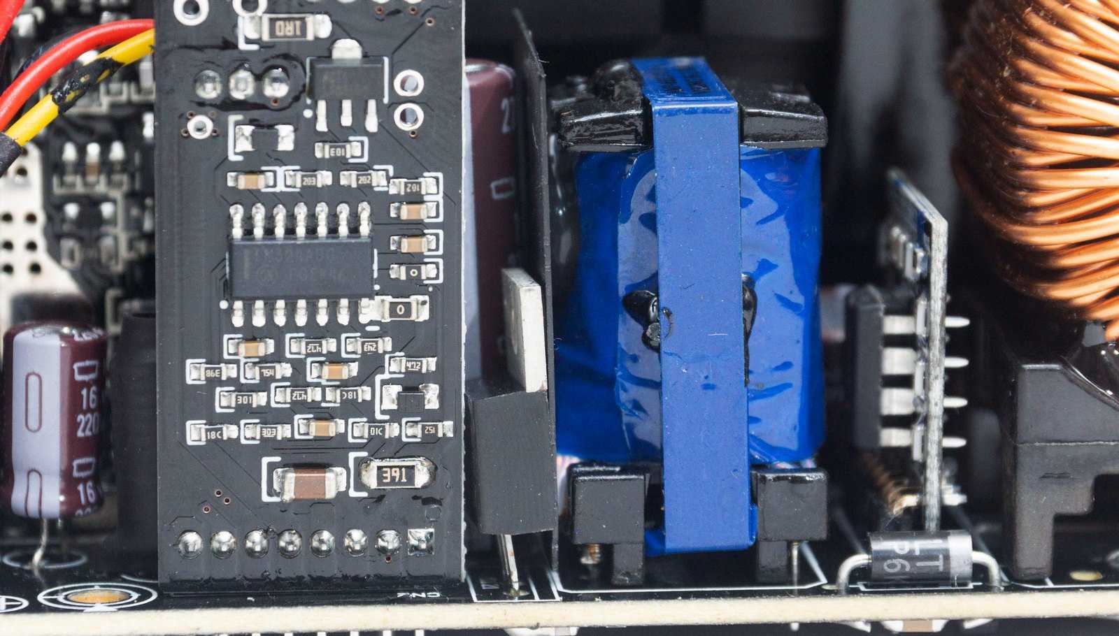 Контроллер преобразователя и корректора мощности на основе микросхемы CM6800TX вынесен рядом на отдельную вертикальную плату. На ней же микросхема CM03X, которая размыкает некоторые цепи при отключении APFC, чтобы уменьшить разрядный ток высоковольтного электролитического конденсатора, что облегчает повторный запуск БП при небольших простоях. Это особенно актуально на новых материнских платах с чипсетами Intel, где первичная инициализация UEFI BIOS при смене комплектующих или при определенных этапах настройки происходит в два этапа.