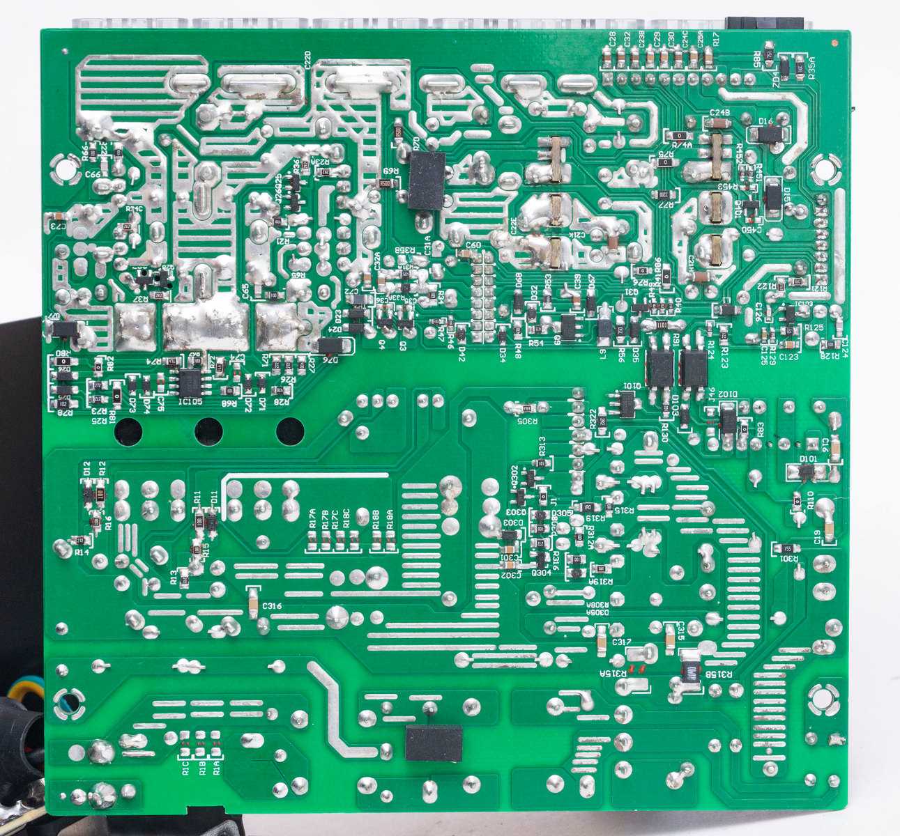 Обратная сторона платы хорошо пропаяна, силовые дорожки усилены слоем припоя. Сюда также вынесенонесколько управляющих микросхемс затертой маркировкой.