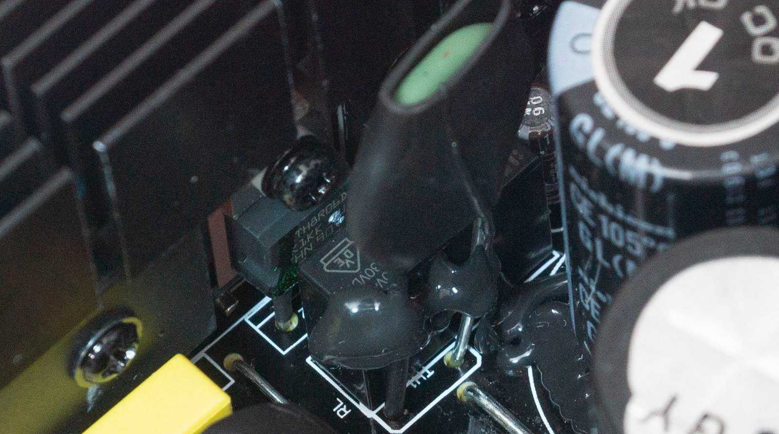 В блоке питания реализован фильтр электромагнитных помех. Одна часть его компонентов распаяна с внутренней стороны входного разъёма на компактной плате, вторая часть (X-кондесаторы и дроссели) — на основной плате. Соединение между ними — проводами, впаянными напрямую без использования клемм.