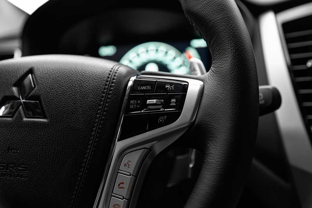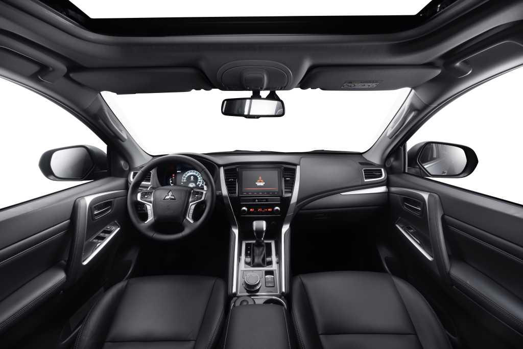 Центральная консоль у Pajero Sport визуально объединена с трансмиссионным тоннелем за счет длинных металлических вставок, выполняющих декоративные функции. В этой части салона расположились сенсорный монитор и многочисленные клавиши с шайбами, предназначенные для управления бортовой электроникой и ходовой частью. Стандартный для Mitsubishi четырехспицевый руль закрывает за собой аналоговую панель приборов с цифровым дисплеем. Передние сидения в топовых версиях Pajero Sport дополняются развитой боковой поддержкой.