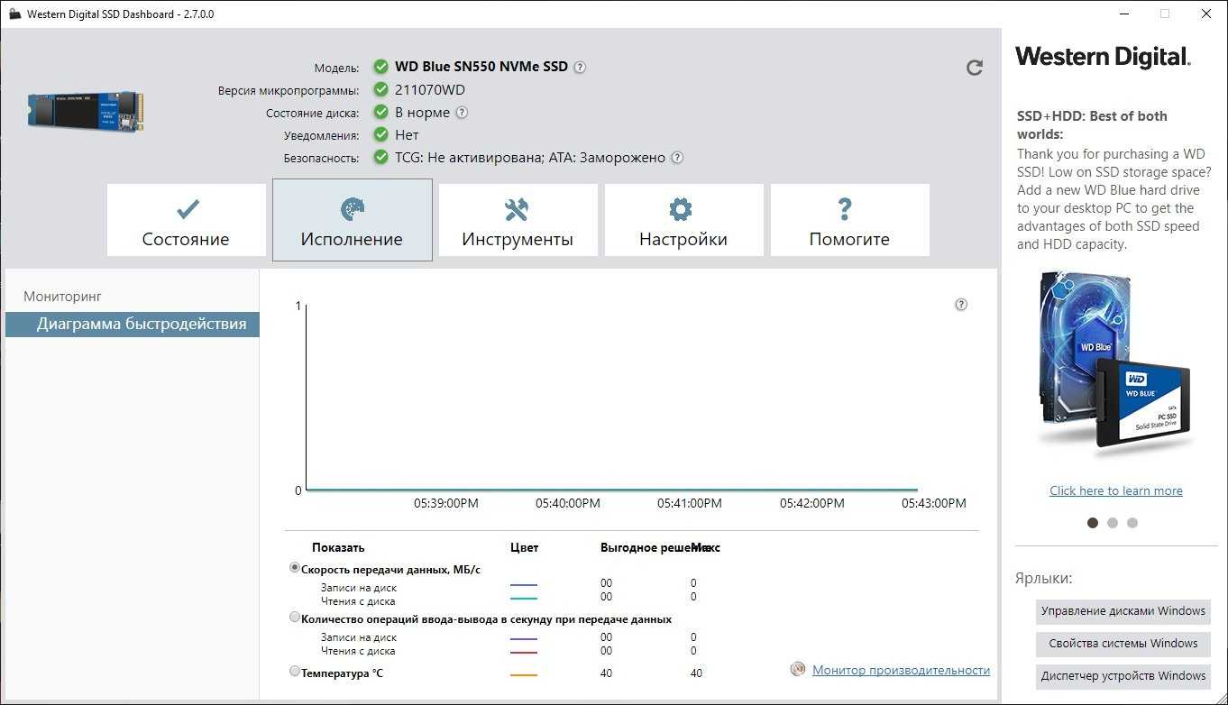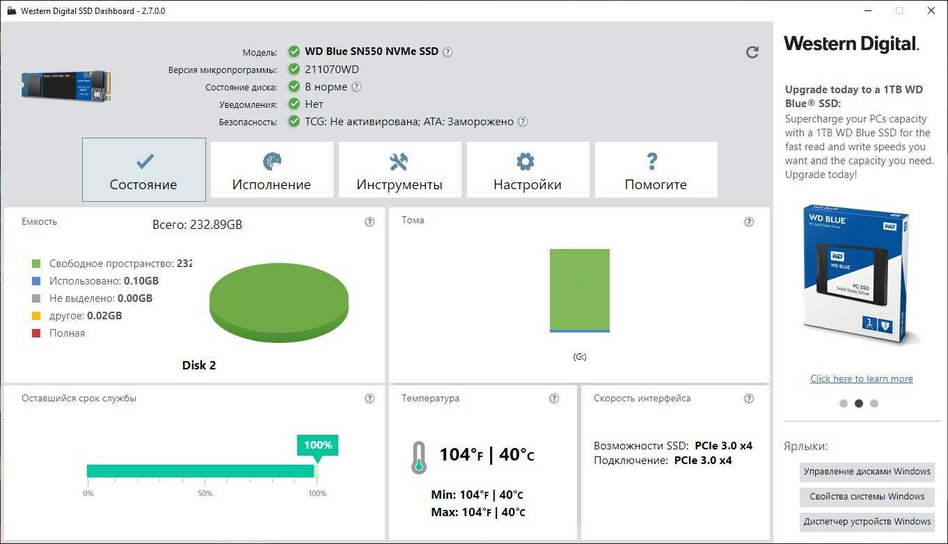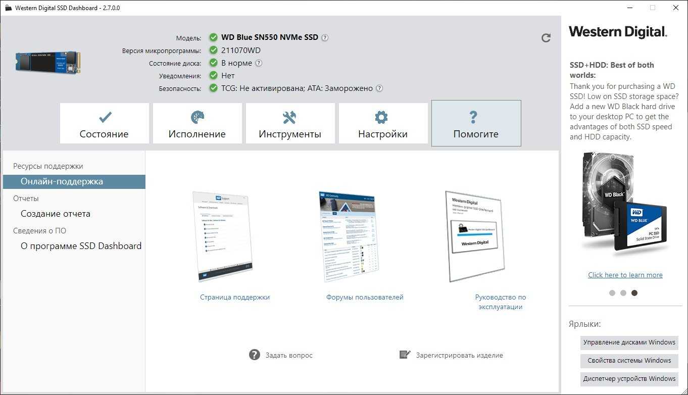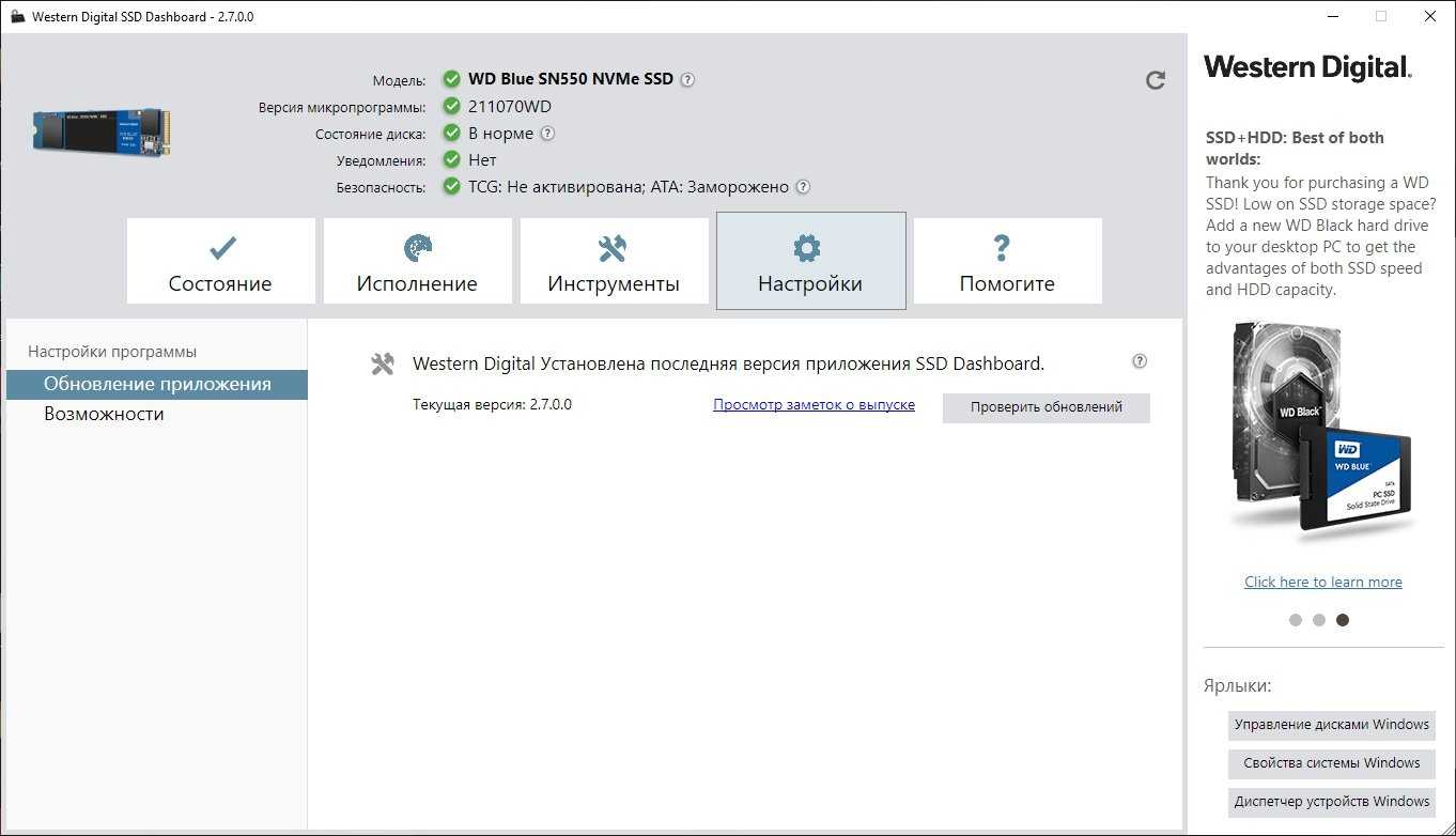 Контролировать состояние накопителя и наблюдать за его параметрами можно, используя фирменное программное обеспечение – Western Digital SSD Dashboard, доступное для загрузки на официальном сайте. Всего утилита содержит пять вкладок.