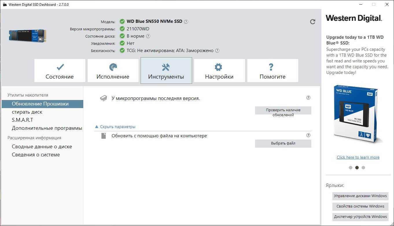 Инструменты. Здесь можно обновить версию прошивки накопителя, стереть диск, провести тестирование S.M.A.R.T., получить полный отчет по диску и системе.
