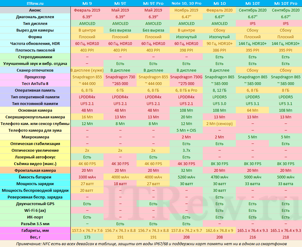 Для наглядности мы подготовили сравнительную таблицу. Здесь есть как Mi 10, 10T и 10T Pro, так и более старые модели, включая Mi 9, Mi 9T и Mi Note 10. Кликните для увеличения