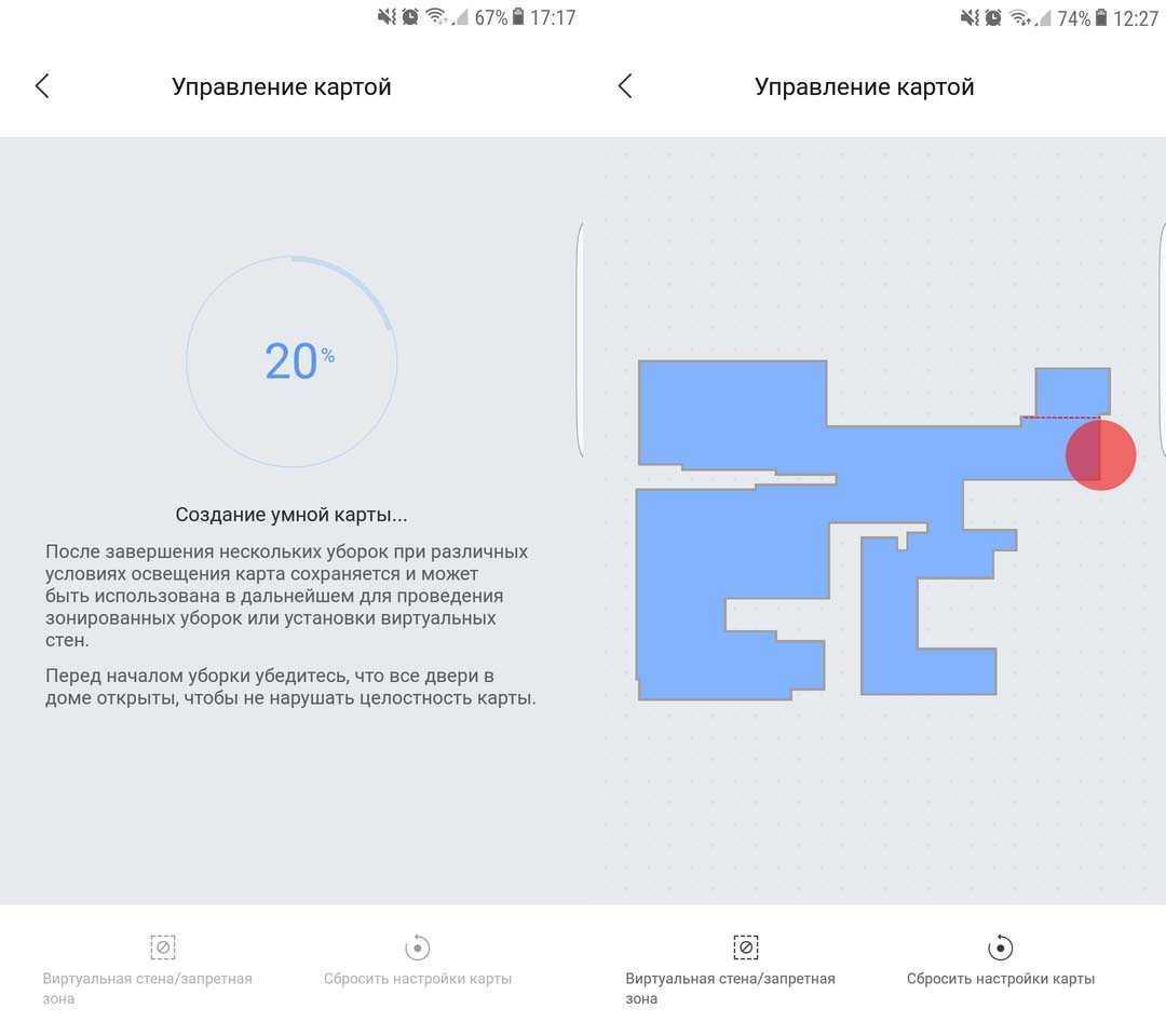 Следующий пункт – управление картой. Тут можно найти одну из самых полезных функций – установку виртуальной стены. Виртуальная стена для робота-пылесоса Xiaomi позволяет запретить ему въезд на определенную территорию. Данная функция становится доступной после нескольких уборок и полного построения карты. Также в настройках, в меню “Экспериментальные функции” нужно включить режим сохранения карты. Суммарное количество виртуальных стен никак не ограничено – наносите столько, сколько нужно. А еще на данном роботе-пылесосе Xiaomi можно настроить зональную уборку. Для этого необходимо на главном экране, на котором отображается карта, нажать на квадратик с плюсиком. Эта функция позволяет убирать в пределах зонированного пространства.