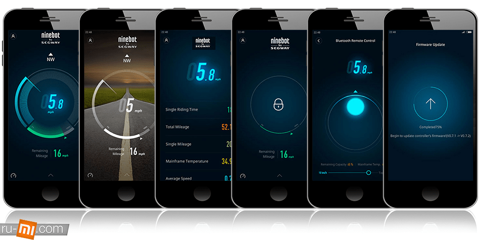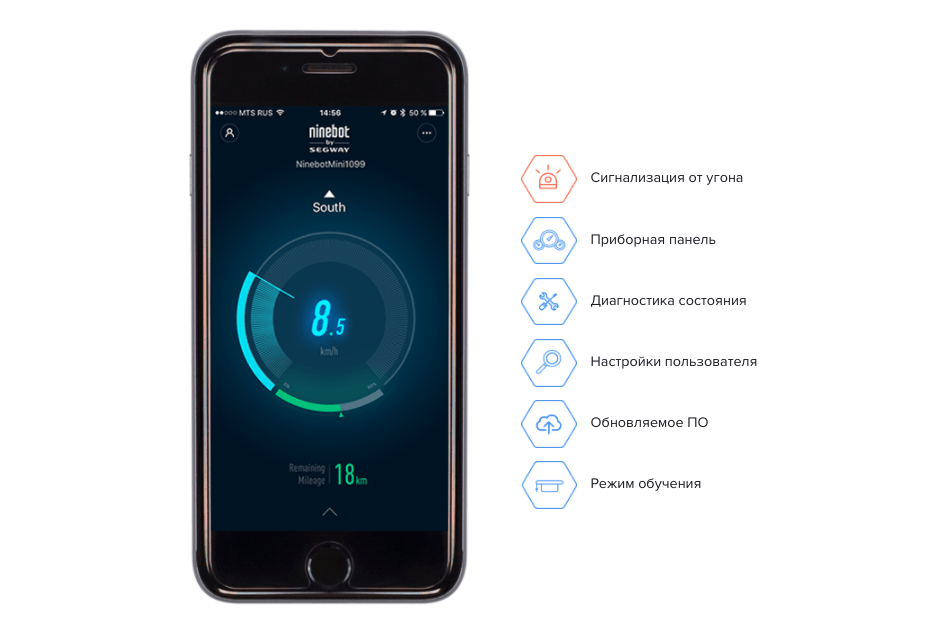 Смартфон и приложение заменяют Ninebot Mini Pro приборную доску: в нем выводится текущая скорость, заряд аккумулятора в мАч, текущие показатели батареи (ток, мощность и температура) и даже температура корпуса.