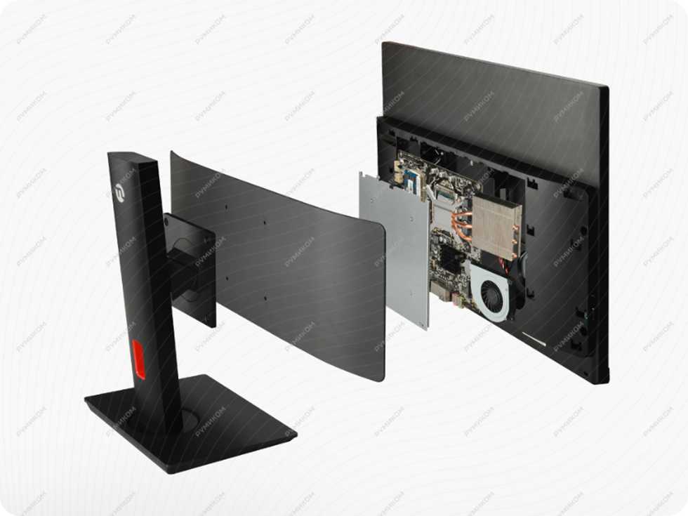 Весь моноблок можно представить как “пирог” из нескольких слоев — слой дисплея, слой рамы, слой электронных компонентов и крышку. У всех компонентов внутри есть достаточно места для отвода тепла, благодаря чему обеспечивается длительный срок службы.