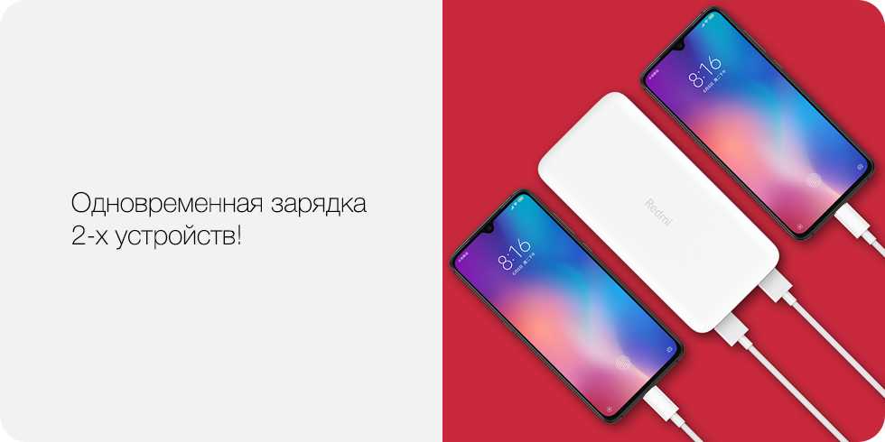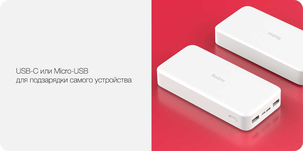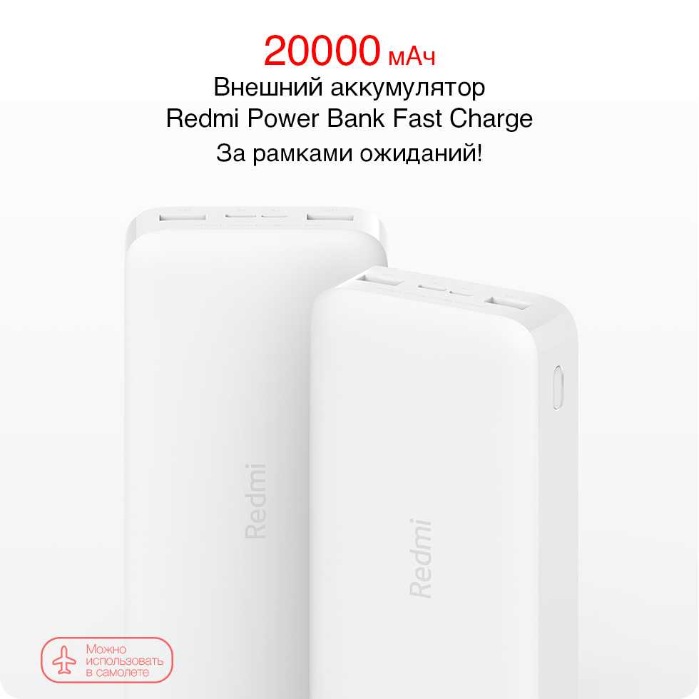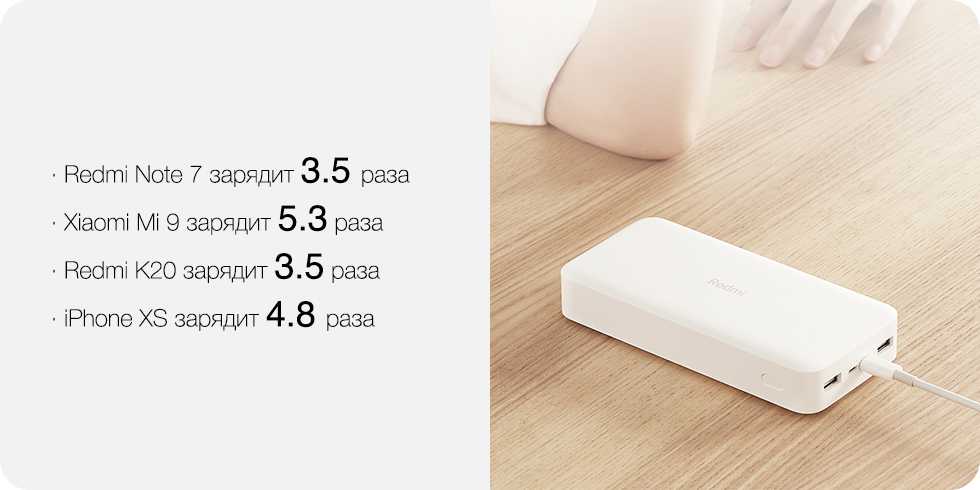 Внешний аккумулятор Redmi ёмкостью 20’000 мАч благодаря умному USB-контроллеру зарядки совместим с абсолютным большинством смартфонов на рынке. Его ёмкости хватит, чтобы 5 раз зарядить Xiaomi Mi 9, и даже после этого он не останется без заряда. С ним можно вообще забыть о ёмкости аккумулятора смартфона.