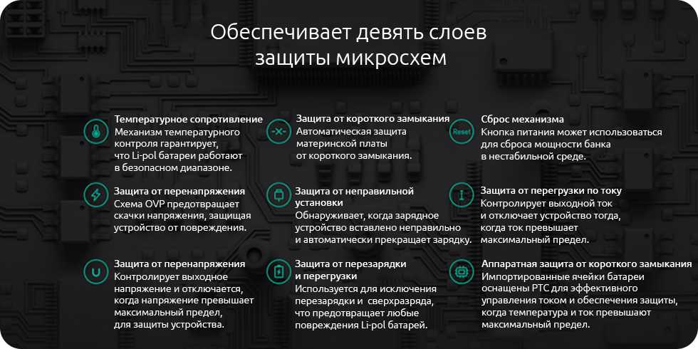 Высокочувствительные ёмкостные датчики и передовая плата управления питанием без риска для аккумулятора и заряжаемых устройств справятся с чрезмерным зарядом или разрядом, коротким замыканием, перегревом и другими проблемами, не подвергая устройства и малейшей опасности.
