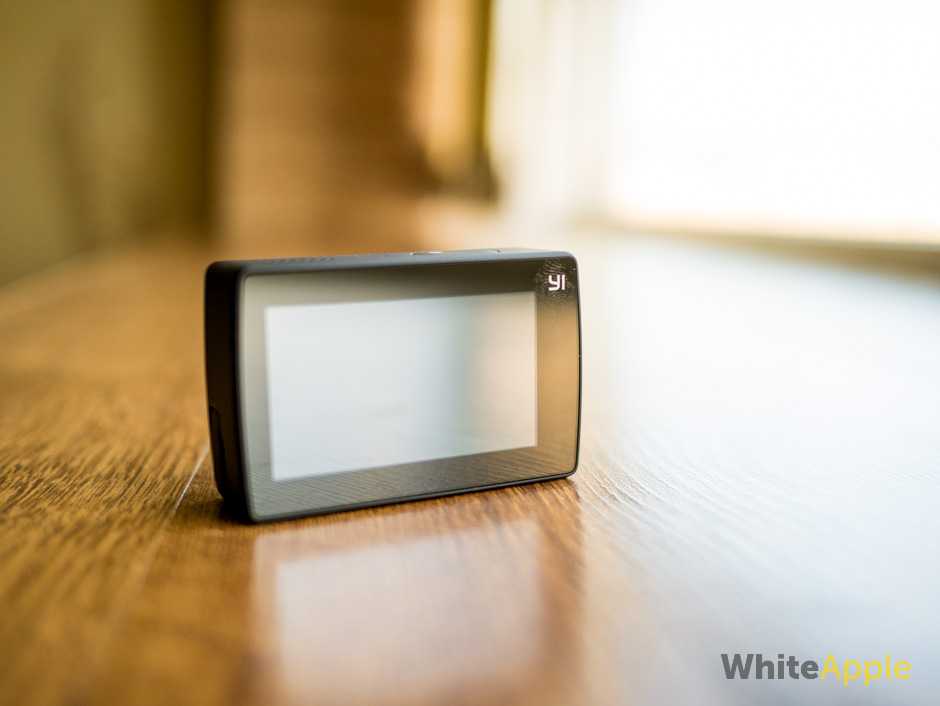 На второй грани есть только отверстие для микрофона (камера пишет стерео звук разумеется). Задняя панель «украшена» только дисплеем с сенсорной панелью, а также блестящим логотипом YI.