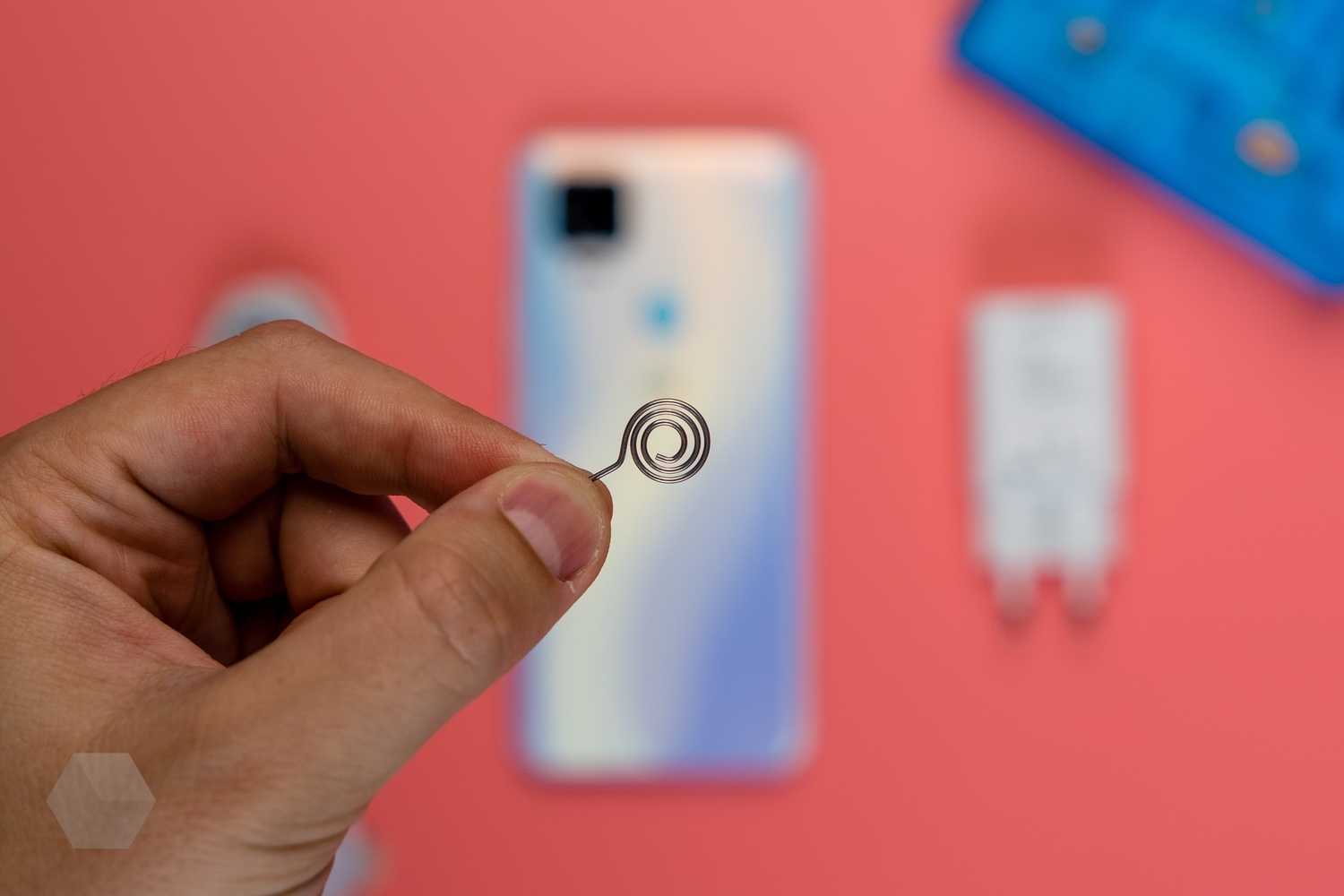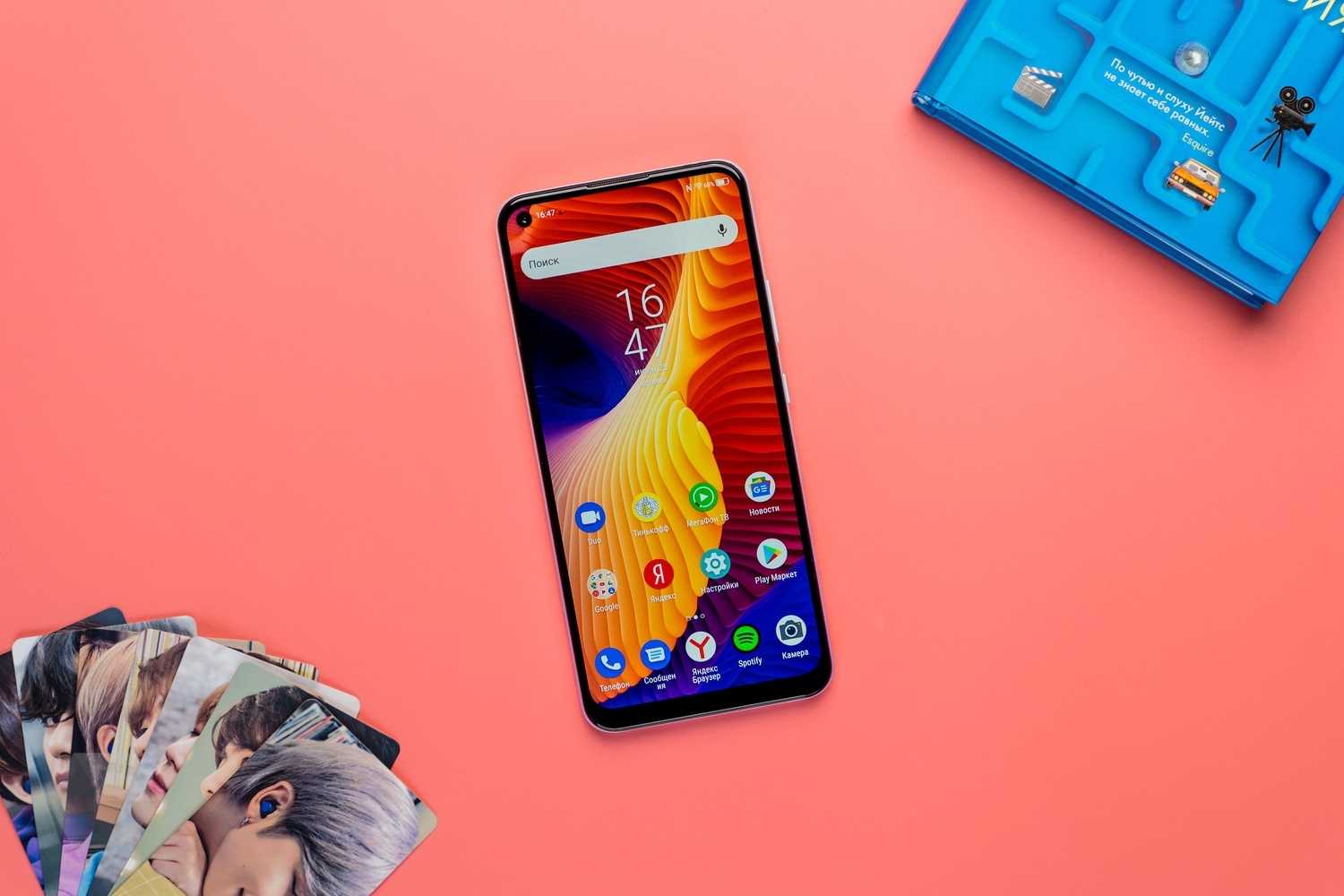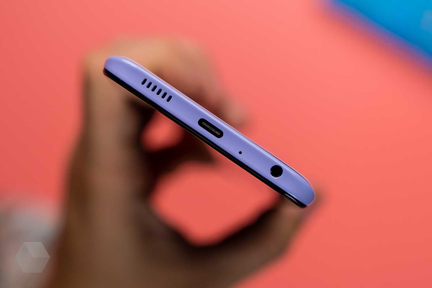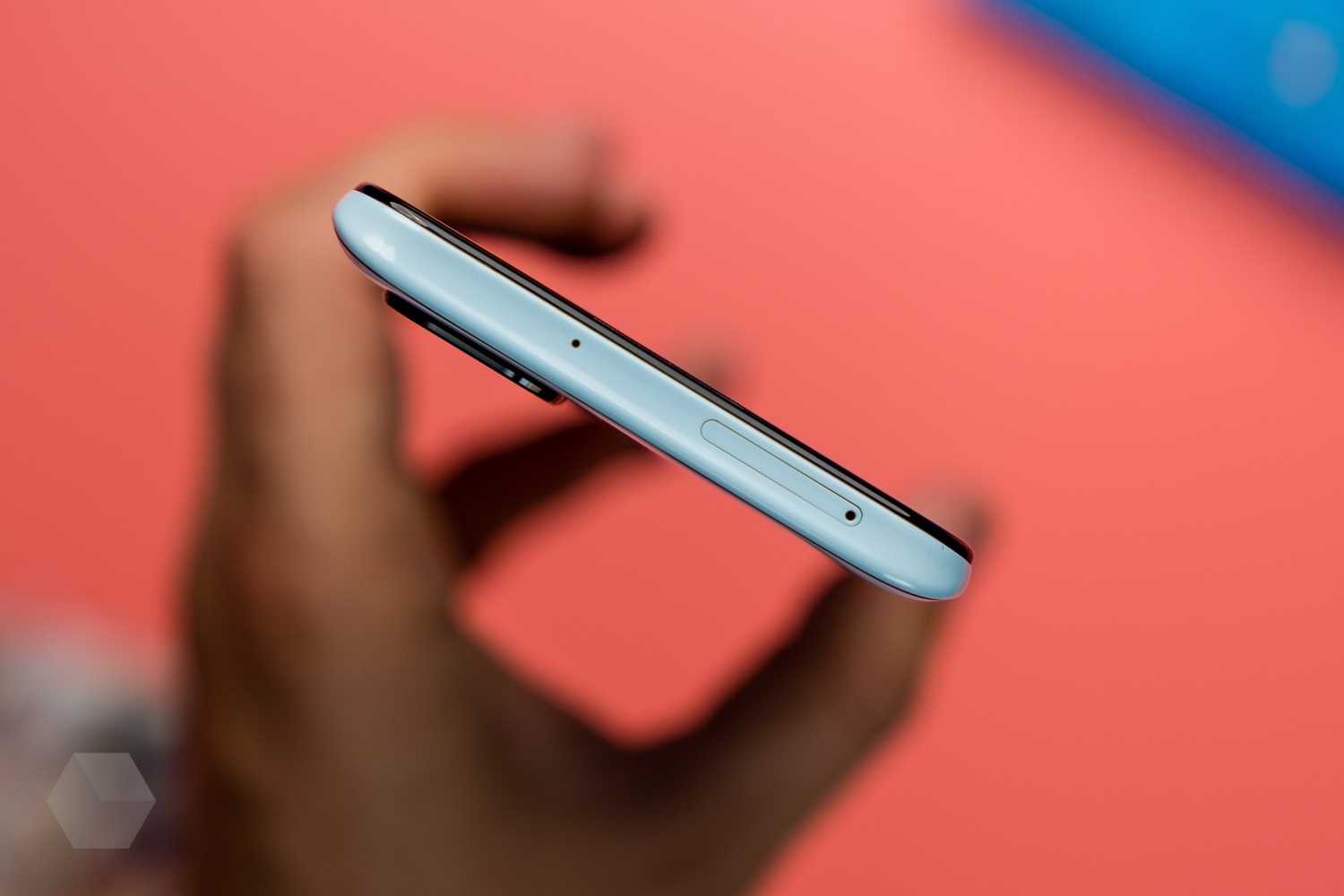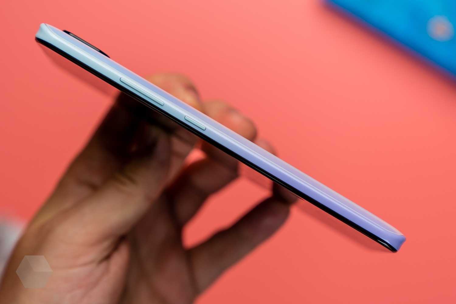 Снизу ещё один микрофон, 3,5-мм мини-джек для наушников, порт Type-C, а также динамик. Сзади — квадратный блок камеры и датчик отпечатков пальцев. Спереди — вырез в экране под фронтальную камеру, а также аккуратно уместившаяся в верхнюю рамку тонюсенькая решётка для динамика.