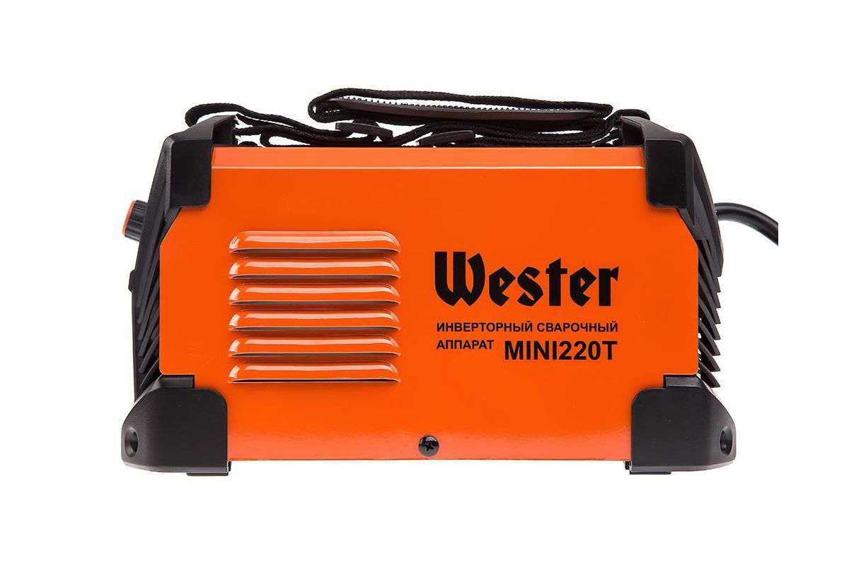 MINI 220T (MMA) марки Wester считается самым маленьким и самым простым в эксплуатации. Силовые показатели устройства — от 30 до 220 А, также имеется приличная мощность — 7 кВт. Аппарат способен долго трудиться без остановок при значительных нагрузках и просадках напряжения. Передняя панель имеет жидкокристаллический дисплей, датчики подключения к энергосети, перегрузку. Есть функции плавной регулировки, горячего старта, антиприлипания, встроенная термозащита. Решетки вентиляции защищены от попадания окалины. Если вы еще не знаете, какой сварочный аппарат лучше, то присмотреть к данной модели.