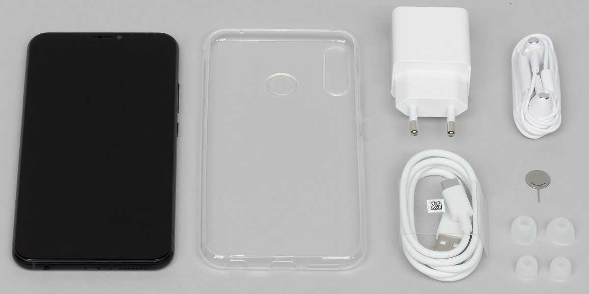 Внутри располагается аппарат, бесцветный чехол из силикона, зарядное устройство 5 В 2 А, кабель USB Type-C, наушники, запасные амбушюры, маленький ключик из металла, чтобы извлечь либо установить SIM-карту и карту microSD.