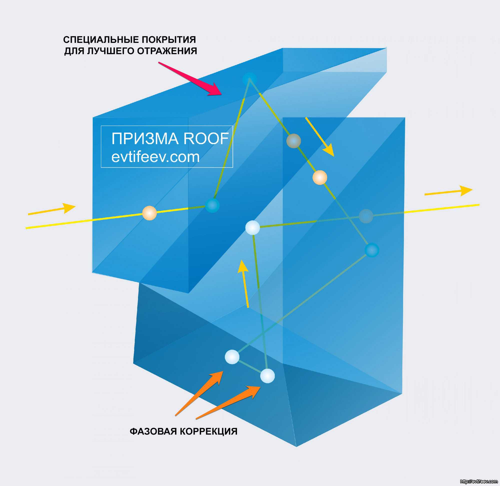 Но бинокли с ROOF призмой могут иметь проблему с фазовым свещением луча света когда он разделяется на два пучка в призме (на «крыше») и на результирующей картинке мы получим менее контрастное и менее резкое изображение чем было бы при использовании PORRO призмы, где нет такого элемента.