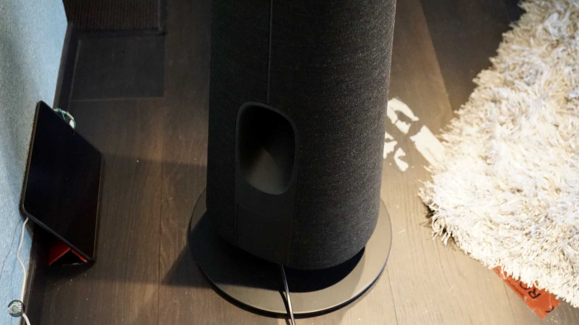 Это две здоровые акустические системы, полностью оправдывающие своё название — башни, как есть башни. Колонки очень любопытно устроены: низкочастотный динамик смотрит вниз, внутри здоровый воздуховод, необходимый для лишнего драматизма при воспроизведении низких частот, сверху, видимо, два среднечастотных драйвера и твитер.