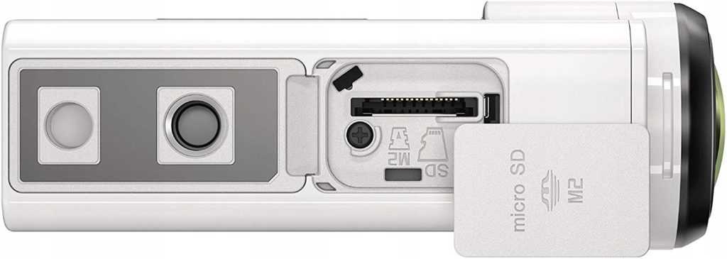 В нижней части камеры — универсальное 1/4-дюймовое штативное гнездо, что позволяет не сковывать себя при выборе аксессуаров для стабилизации. Например, в тех же GoPro, для фиксации моноблока на стойке или штативе, придется «нарядить» камеру в защитный бокс и купить переходник. Также здесь есть отсек для карт памяти стандарта M2 и MicroSD, закрытый заглушкой.