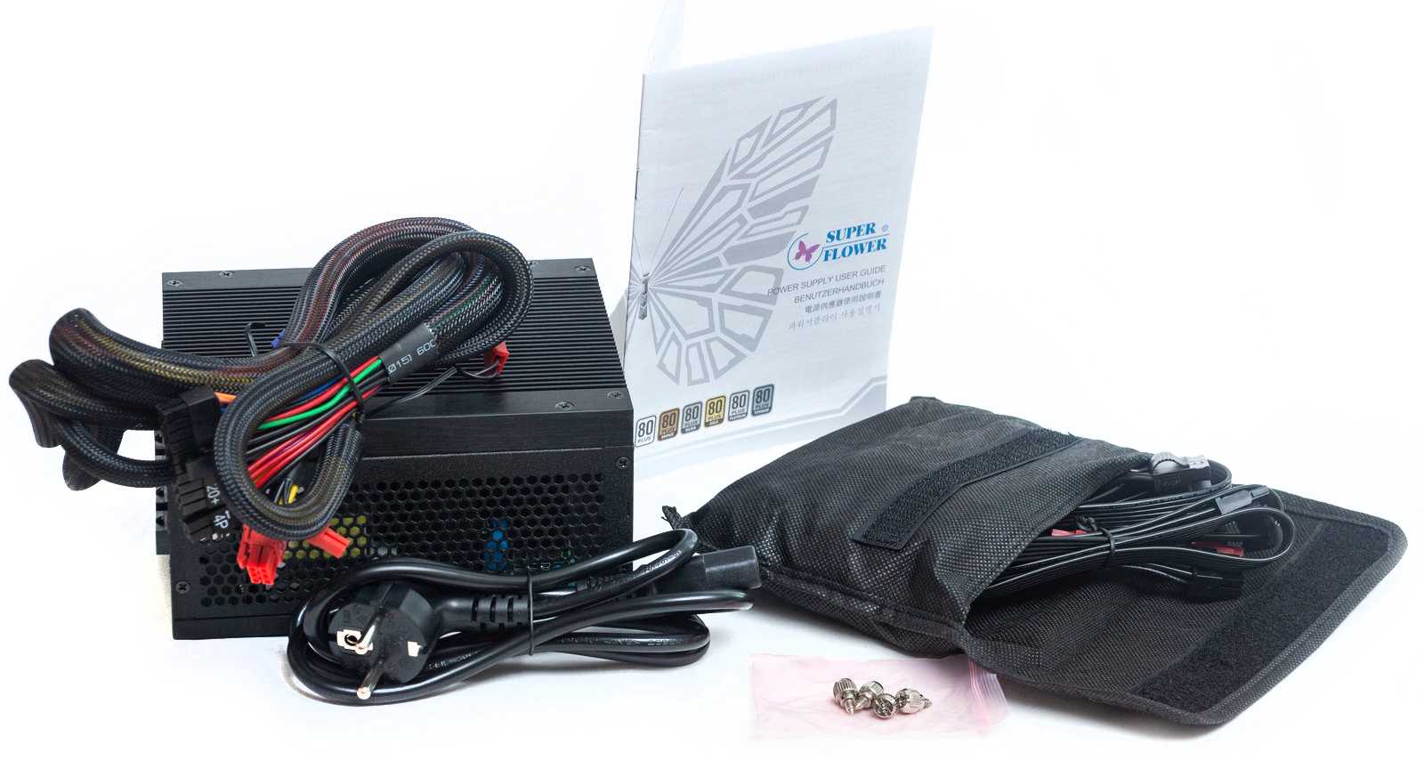 В комплект входят модульные кабели в тканевой сумке на липучках, сетевой кабель, инструкция и винты крепления с накатанными головками.