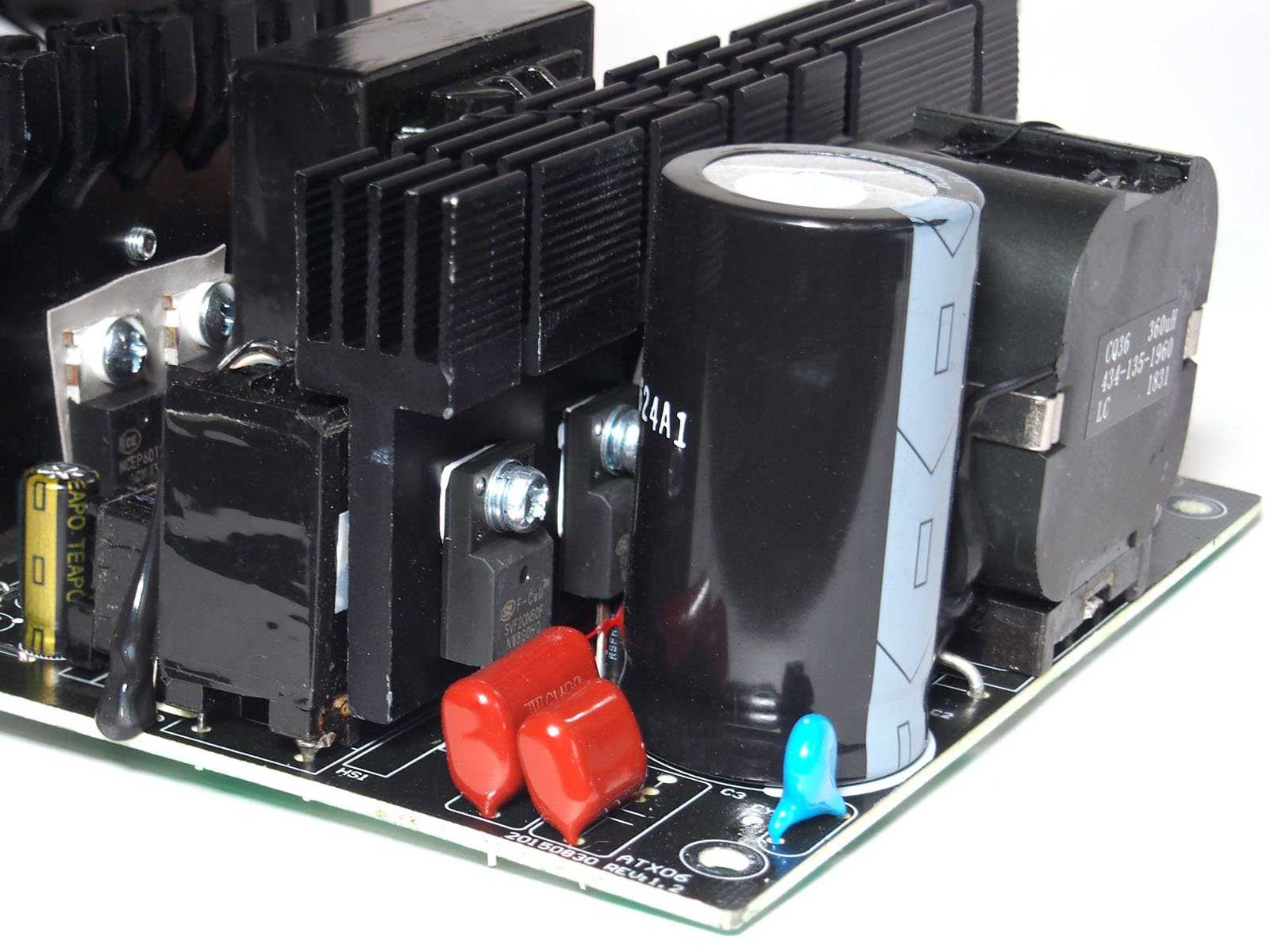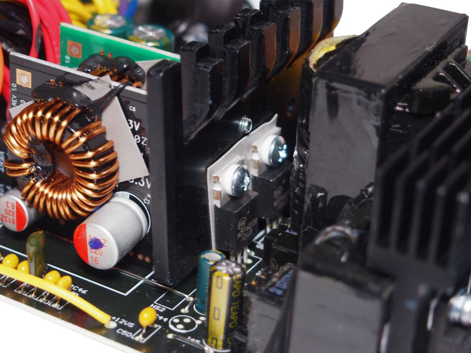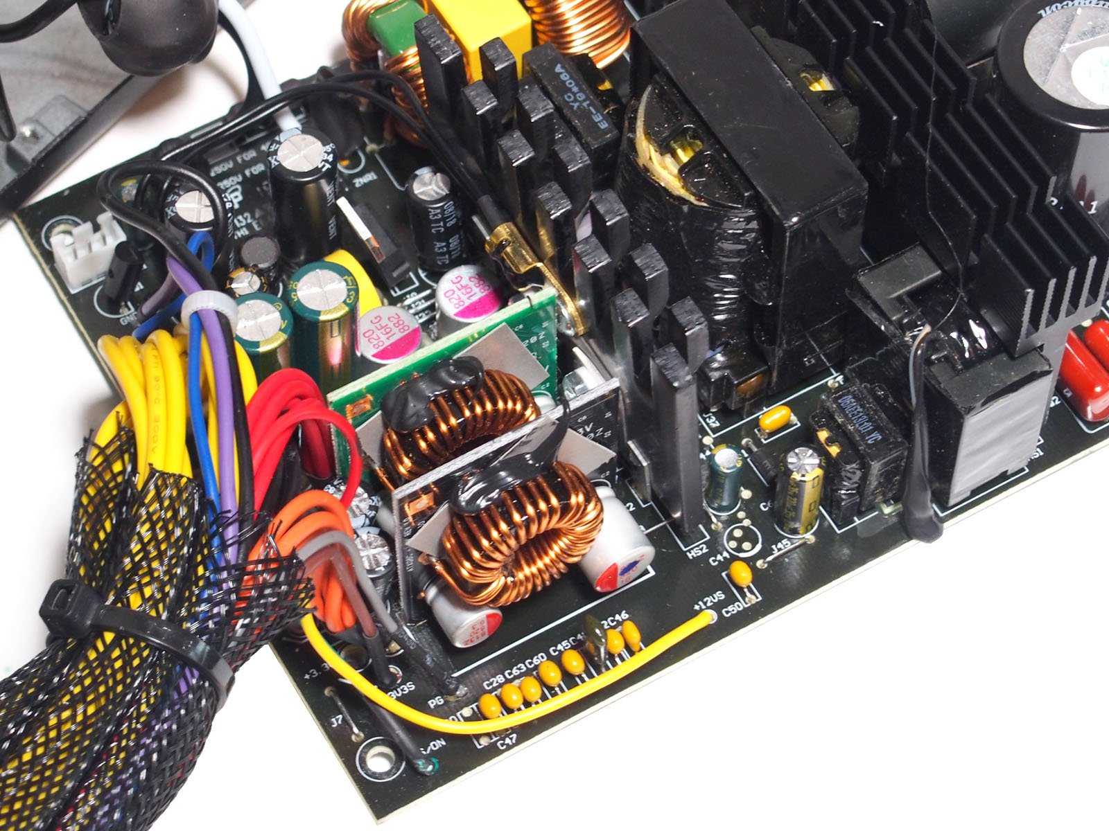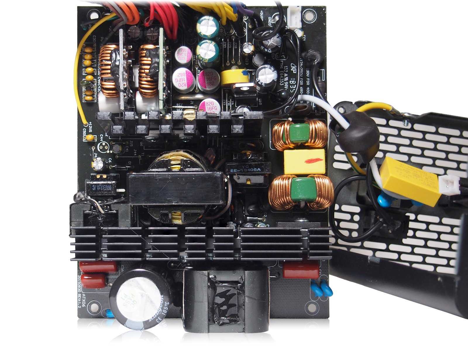 Для наилучшей утилизации внутреннего пространства многие компоненты БП размещены на небольших вертикальных платах. Блок использует управление на микроконтроллерах от Texas Instruments, поэтому часть микросхем отделена ламинированными фольгированными экранирующими вставками, попутно играющими роль и термоэкранов. Общее исполнение и пайка аккуратные, многие соединения дополнительно усилены герметиком белого цвета.