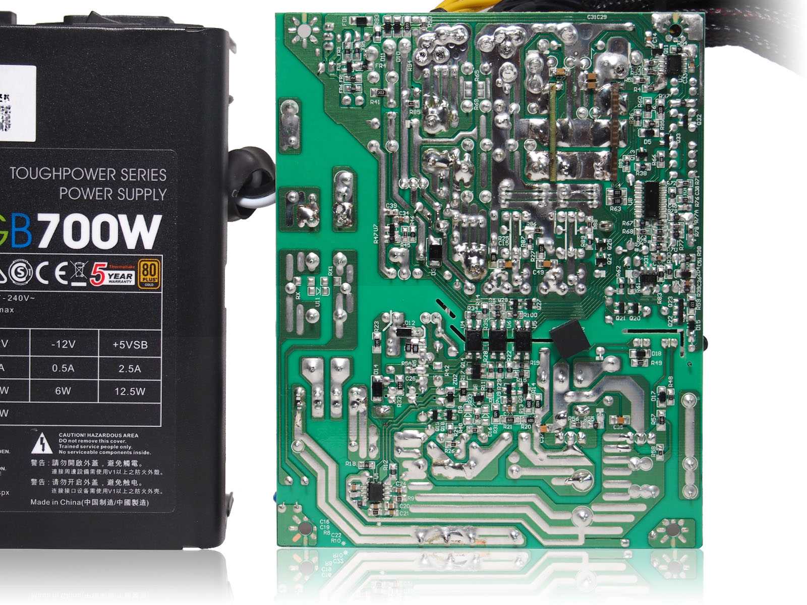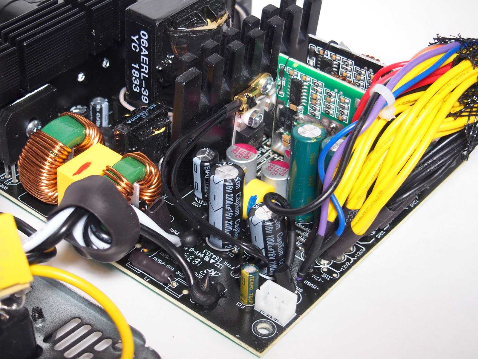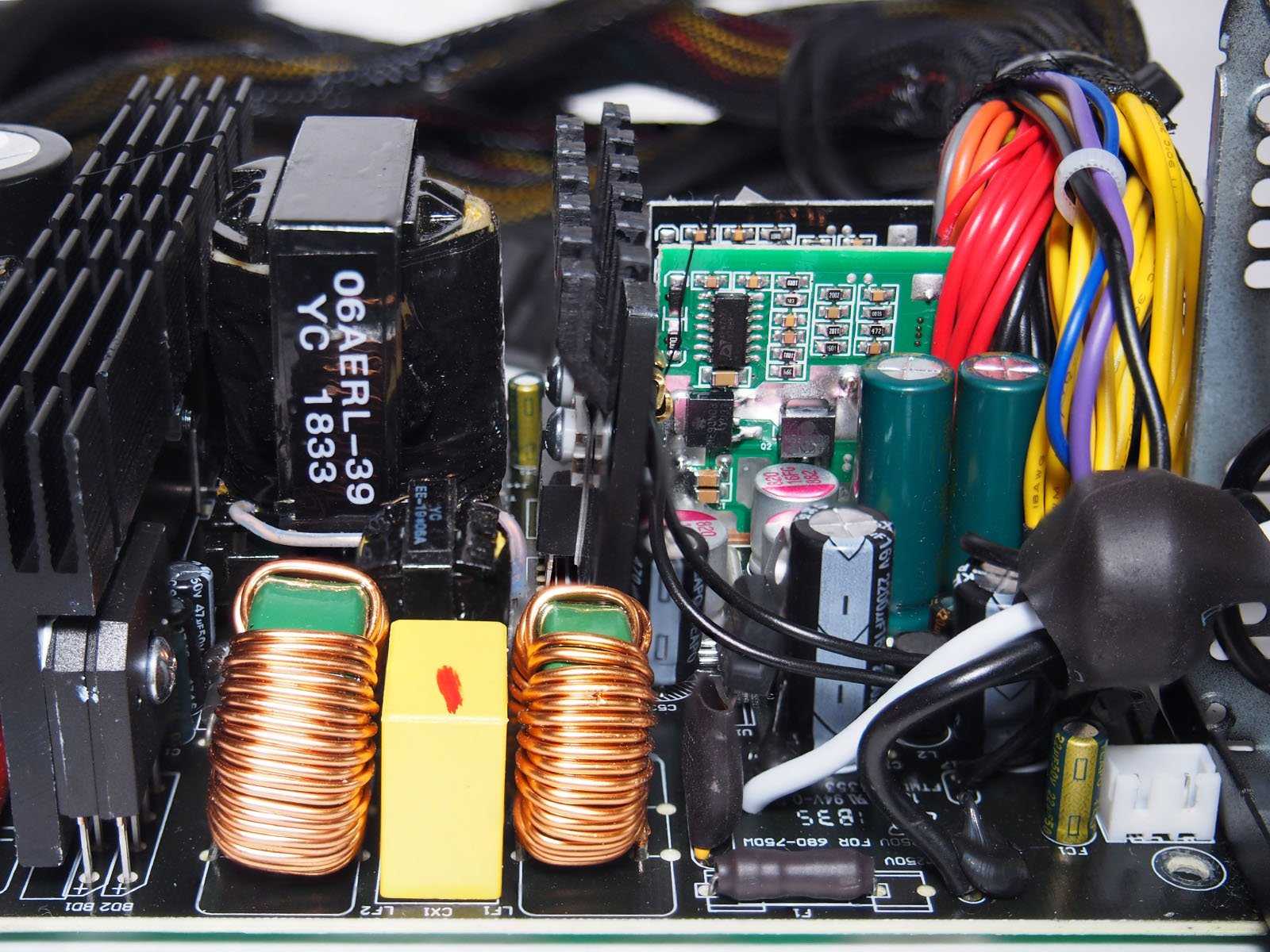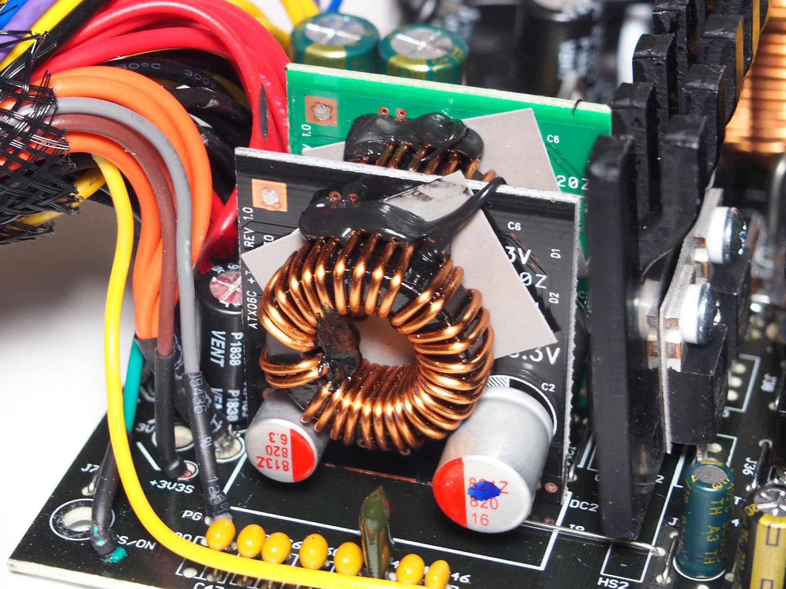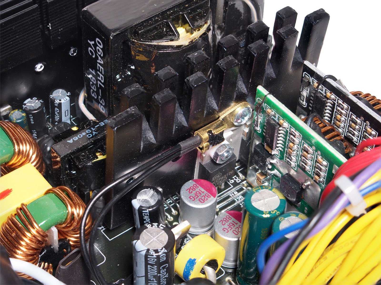 Для наилучшей утилизации внутреннего пространства многие компоненты БП размещены на небольших вертикальных платах. Блок использует управление на микроконтроллерах от Texas Instruments, поэтому часть микросхем отделена ламинированными фольгированными экранирующими вставками, попутно играющими роль и термоэкранов. Общее исполнение и пайка аккуратные, многие соединения дополнительно усилены герметиком белого цвета.