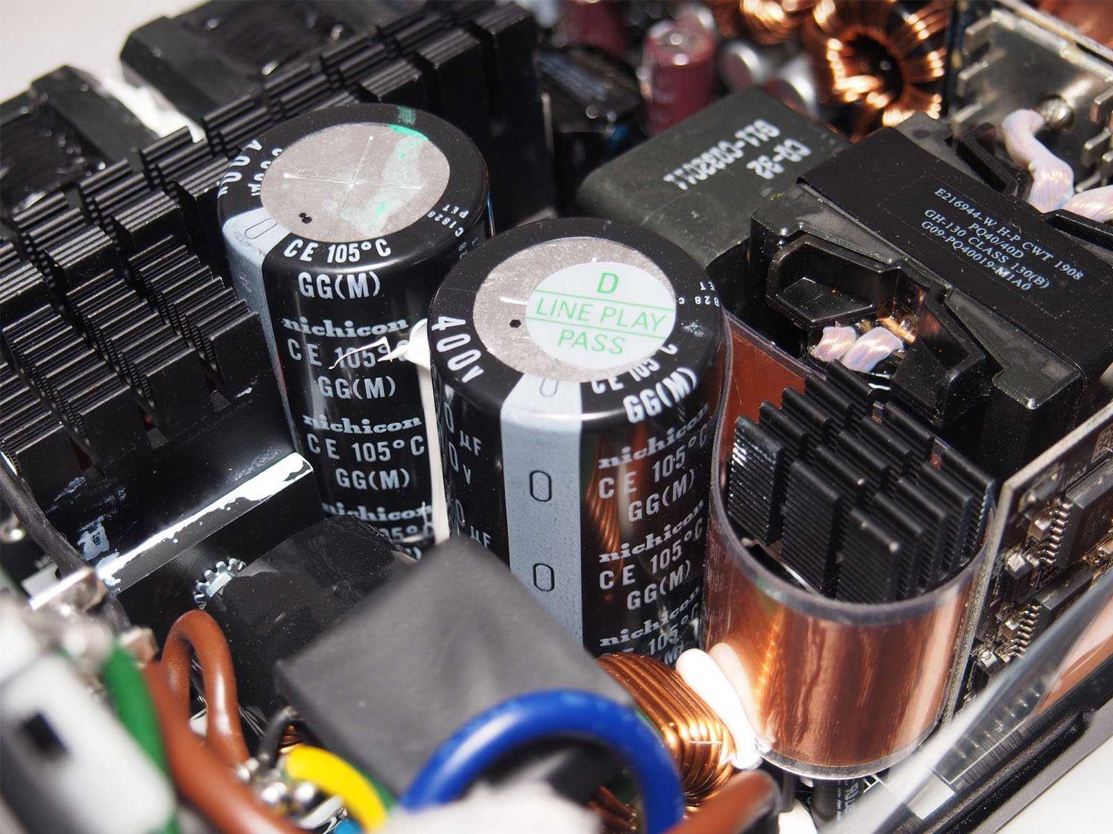 На высоковольтных конденсаторах не экономили: используются два параллельно установленных экземпляра (400 В, 470 uF, 105С) производства японской корпорации Nippon Chemi-Con с рабочей температурой до 105 °C. Суммарной ёмкости достаточно, чтобы обеспечить заявленные 16 мс удержания.