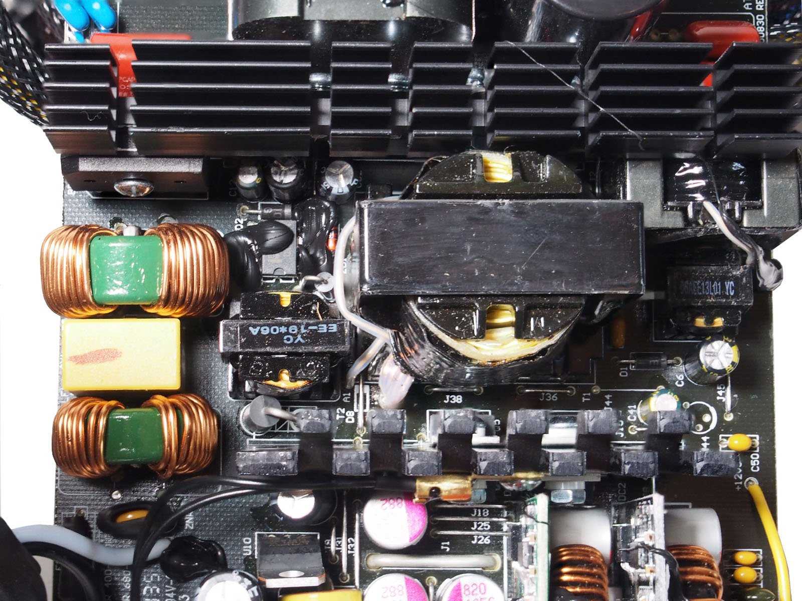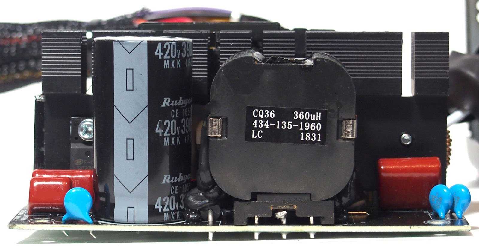 Размещение элементов на плате плотное и аккуратное, оставляющее пространство для воздушных потоков, нагнетаемых вентилятором. Часть компонентов вынесена на отдельные вертикальные платы. Выводы выходных проводов впаяны в плату напрямую достаточно компактно в углу, не загромождая внутреннее пространство. Некоторые элементы и точки соединений дополнительно зафиксированы герметиком черного цвета. Схема блока питания построена на резонансном полумостовом LLC-преобразователе и раздельной DC-DC стабилизации.