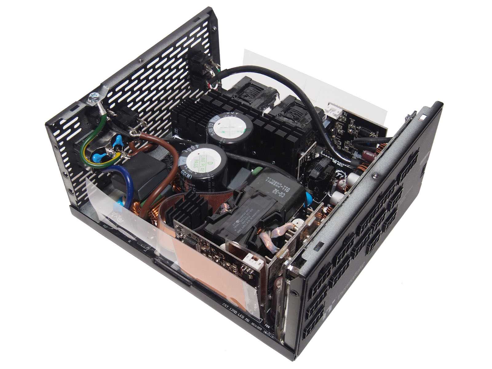 Примечательно, что «киловаттник» уместили в корпусе того же размера, что и модель на 850 Вт. Это обеспечивает высокую совместимость даже с не самыми крупными вариантами middle-tower-корпусов. Внутренняя компоновка получилась очень плотная, но без избыточного нагромождения. Thermaltake заявляет об отсутствии проводных соединений внутри, но по факту это касается выходных линий питания. Разъём на входе, а также управление питанием вентилятора и подсветки всё-таки не обошлись без проводов.