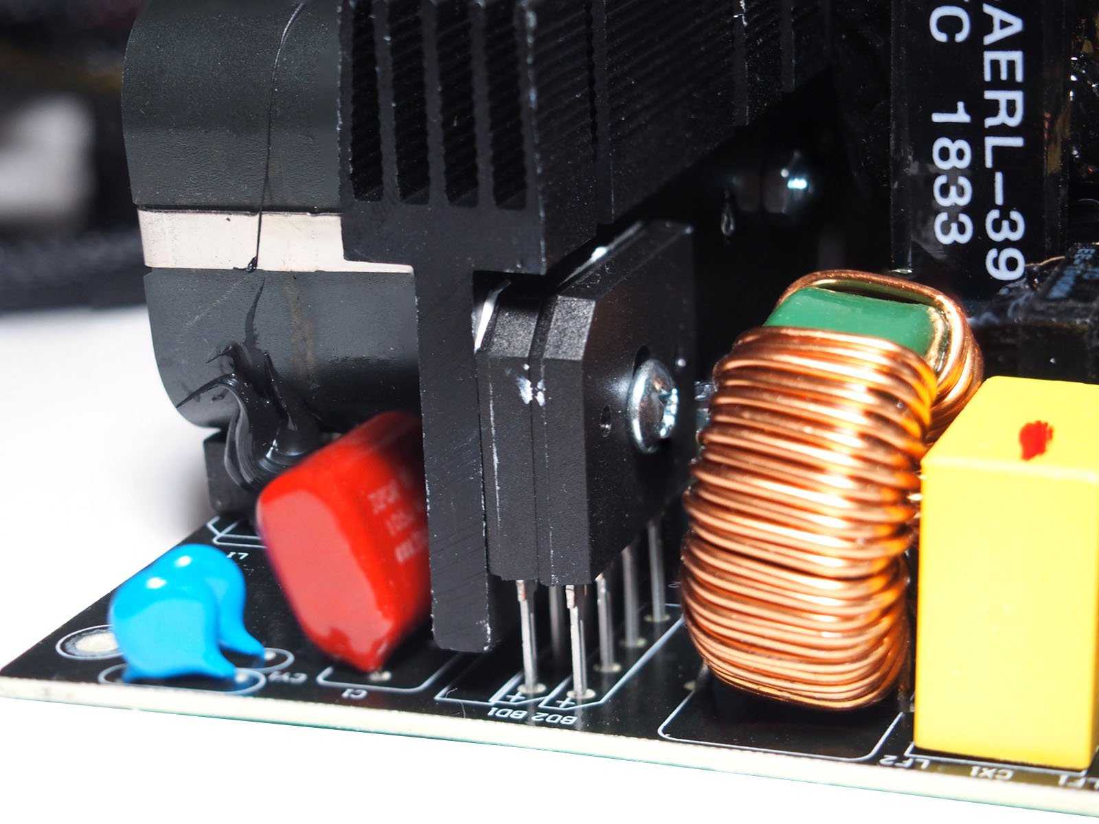 Этот же радиатор охлаждает элементы цепи активного корректора мощности и преобразователя. Три элемента корректора, маркировку которых не разобрать, закрыты от взора крупным корпусом дросселя с пластиковым кожухом и обильным слоем герметика.
