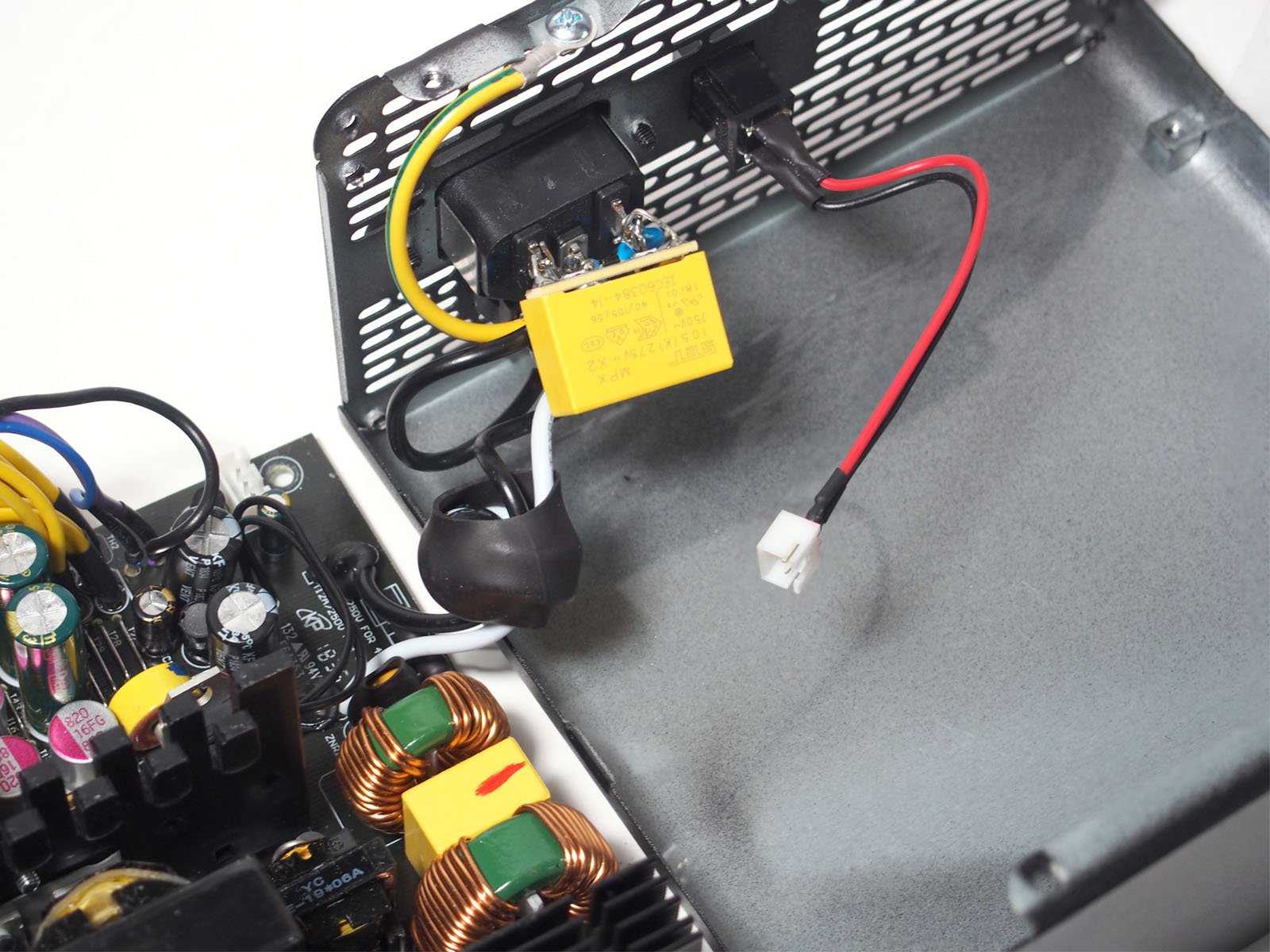 Провода от входного разъема питания сети переменного тока напряжением 110 — 230 В припаяны в плату через фильтр электромагнитных помех, первая половина которого распаяна непосредственно на разъеме, а вторая — на основной плате. Заземляющий провод прикручен на неокрашенную часть корпуса винтом. Кнопка управления подсветкой вентилятора подключается через двухконтактный разъем на отдельном проводе.