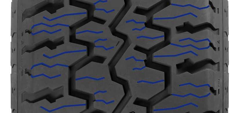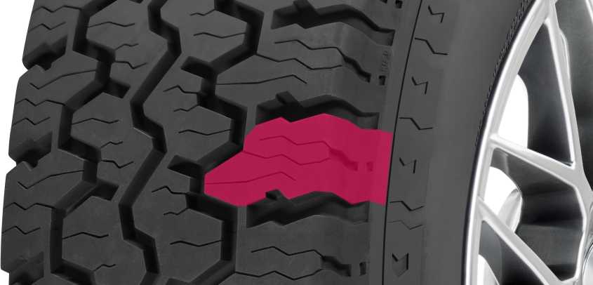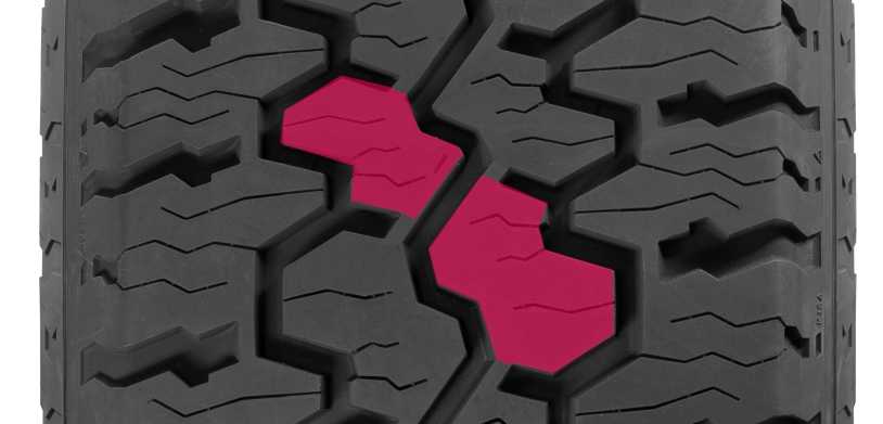 Плечевая зона имеет выраженную зубчатую конструкцию, отвечая за проходимость шины по бездорожью.