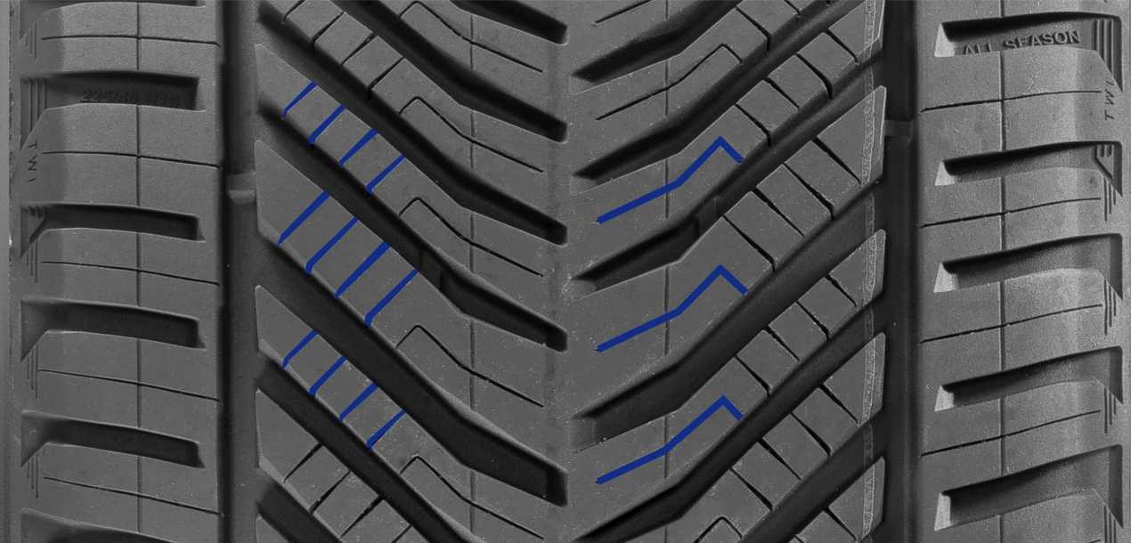 Сеть ламелей, прорезающих блоки, усиливает тягово-сцепные свойства шины, улучшает ее маневренность, сокращая тормозной путь на сухом асфальте.