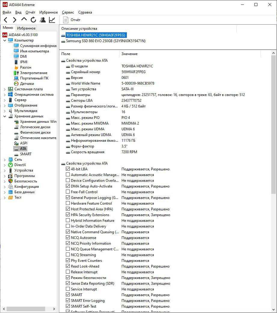 Расширенные сведения о диске получены с применением профессионального программного инструмента AIDA64 Extreme. Позволяет узнать, какие свойства поддерживаются накопителем.