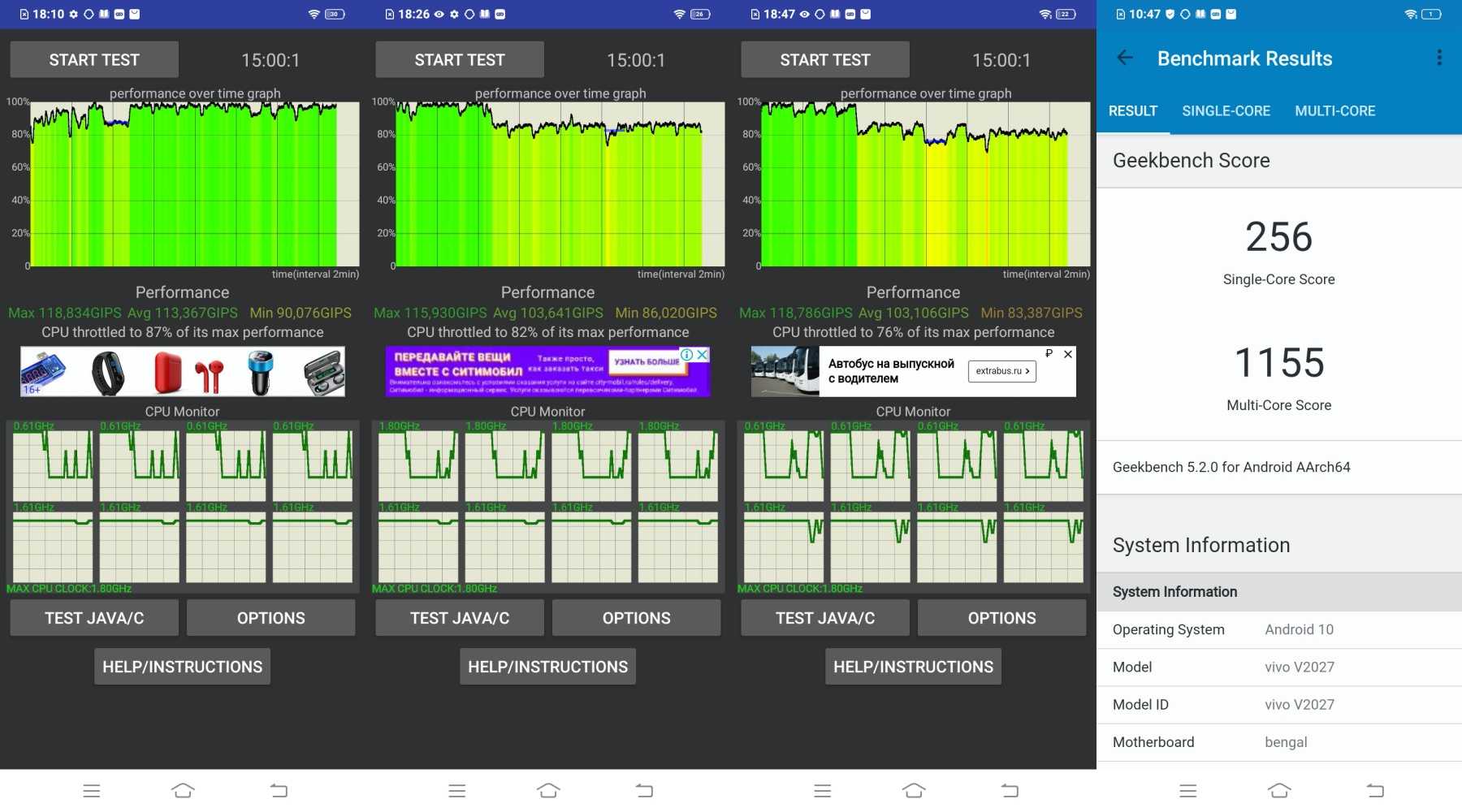 Если прогнать синтетические тесты, то получаем привычные для недорогого смартфона результаты. К примеру, в AnTuTu vivo Y20 выбивает почти 150 тысяч очков, обычный показатель. Если запустить несколько циклов троттлинг-испытания, то заметно, как проседает процессор, показатели падают на 20 %.