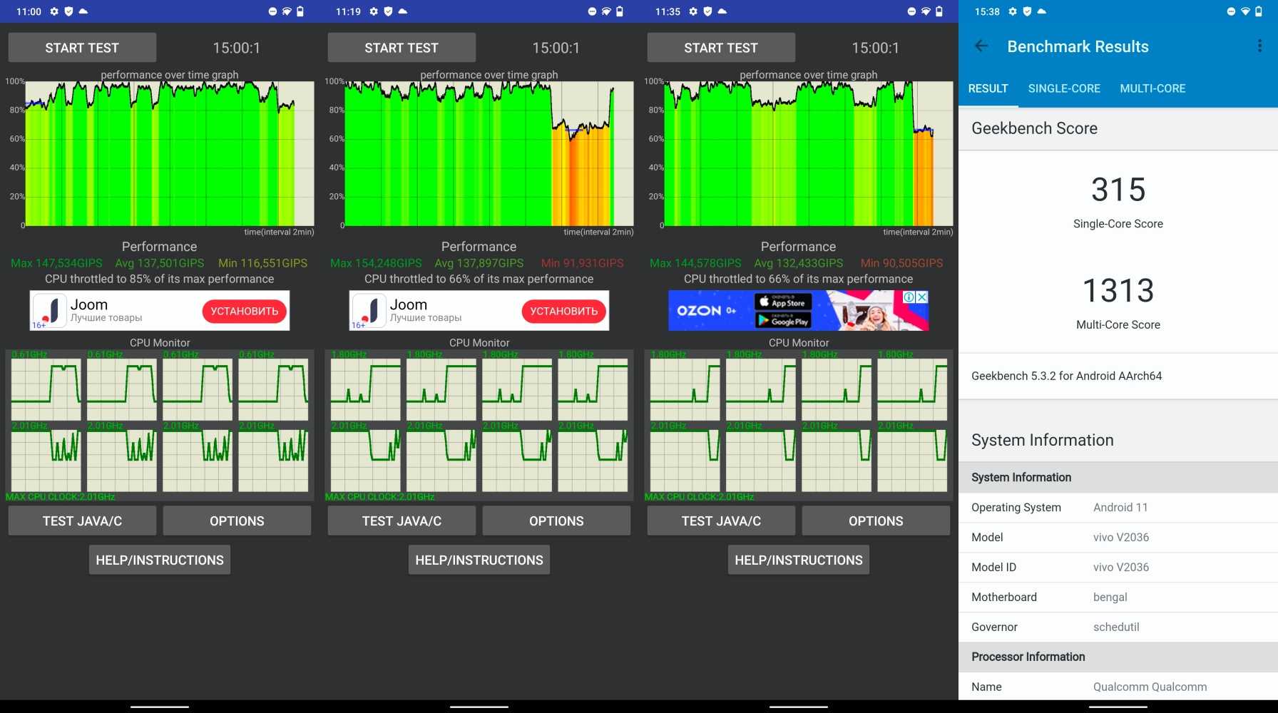 В тестах дело обстоит нормально, телефон может и не геймерский, но поиграть можно во что угодно, если не переборщить с настройками графики и выбрать средние параметры. Тесты на троттлинг телефону не по нраву, под нагрузкой vivo Y31 проседает.