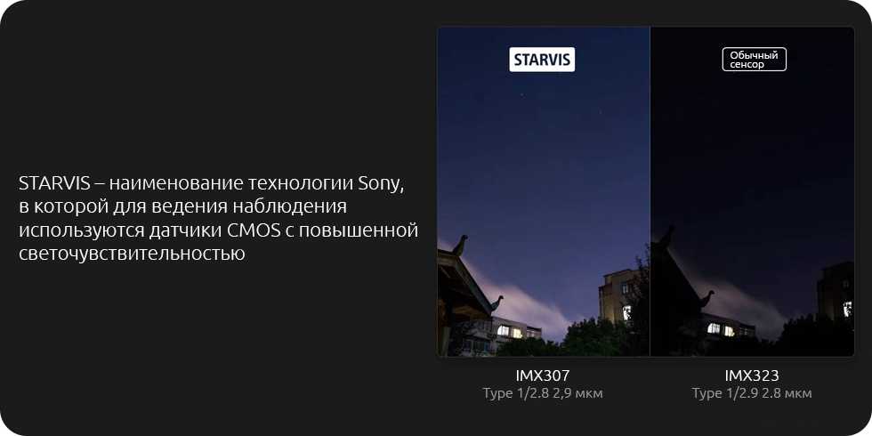 Сенсор Sony IMX307 — один из сенсоров серии Starvis с повышенной светочувствительностью в темноте. Ночью или темным вечером он выдает картинку поразительной четкости и качества, недостижимого для обычных сенсоров.
