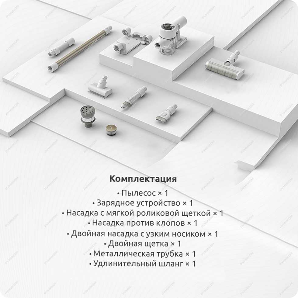 Вместе с основным модулем Xiaomi Dreame T20 мы найдём полный набор аксессуаров. Устройство оснащено прочной металлической трубой характерного для Dreame алого цвета. Есть две щётки с вращающимися роликами: большая для полов и поменьше, с более длинными щетинками для уборки ковров или диванов. Имеются в комплекте и узкие щелевые наконечники двух размеров со скользящими щетинками (в случае более широкой).