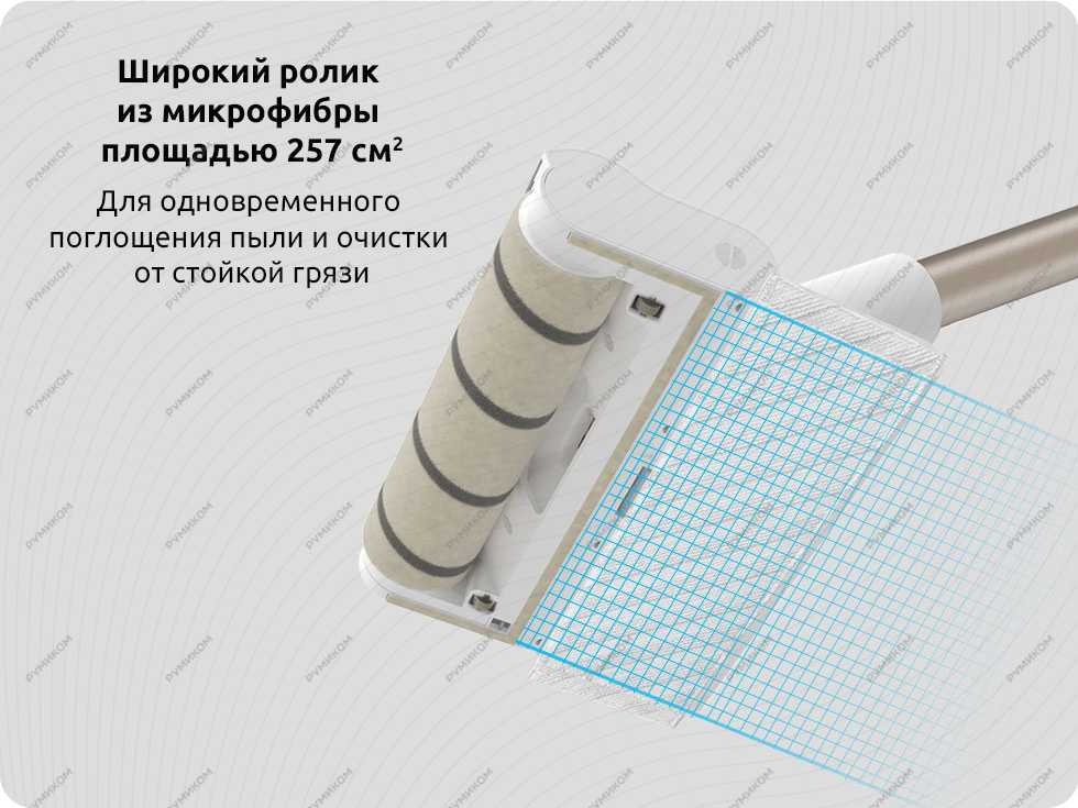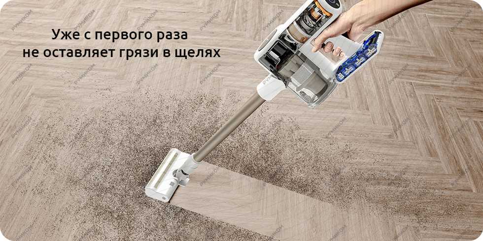 - Боковая щетка вращается на высокой скорости, подхватывает мусор, направляет его к всасывающему соплу с V-образной турбощеткой.