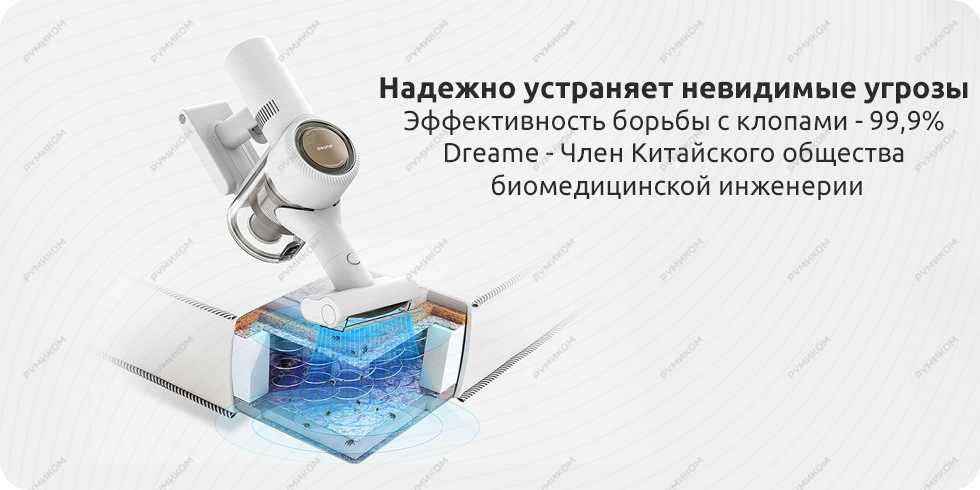 У насадки для удаления клопов есть собственный электродвигатель, который позволяет ей проникать в структуру ткани и глубоко очищать постельные принадлежности, диван, обивку мебели и другие предметы. Пылесос Dreame эффективно удаляет 99.9% клопов, а также микроскопические частички кожи и аллергены, обеспечивая мягкий уход за вещами и кожей, с которой они контактируют.