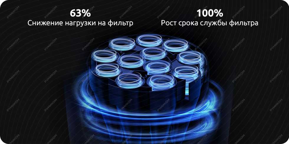 Пятислойная фильтрация системы позволяет удалять частицы мусора размером до 0.3 микрон. Эффективность циклонной фильтрации составляет 99.67%, благодаря чему нагрузка на фильтрующий элемент снизилась на 63%.